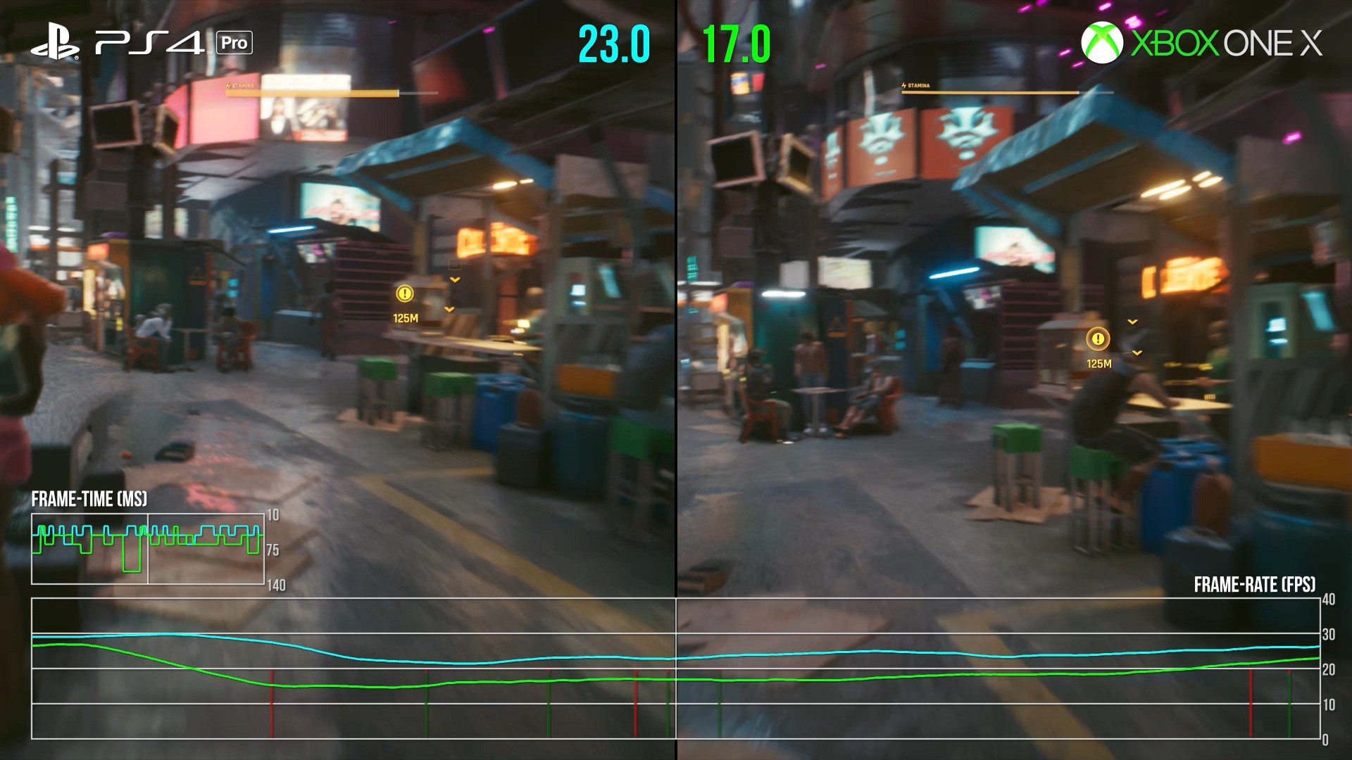 So, beyond the bugs, crashes and glitches, what are the issues facing the last-gen machines? Everything about what we've seen so far suggests bottlenecks on multiple fronts. The base Xbox One S is the weakest last-gen machine and has the most issues - performance is even lower than the already poor PlayStation 4, visual effects are pared back more noticeably and resolution seems to drop to lows in the region of just 1200x675. On the other end of the scale, our tests suggest that PlayStation 4 Pro is probably the most stable last-gen version available right now - performance can still drop dramatically, but it can still beat out Xbox One X by up to five frames per second, which is actually a very big deal when the frame-rate is so low to begin with. The shot below highlights the issue - navigating the city, or driving through it at speed causes problems on every last-gen console.