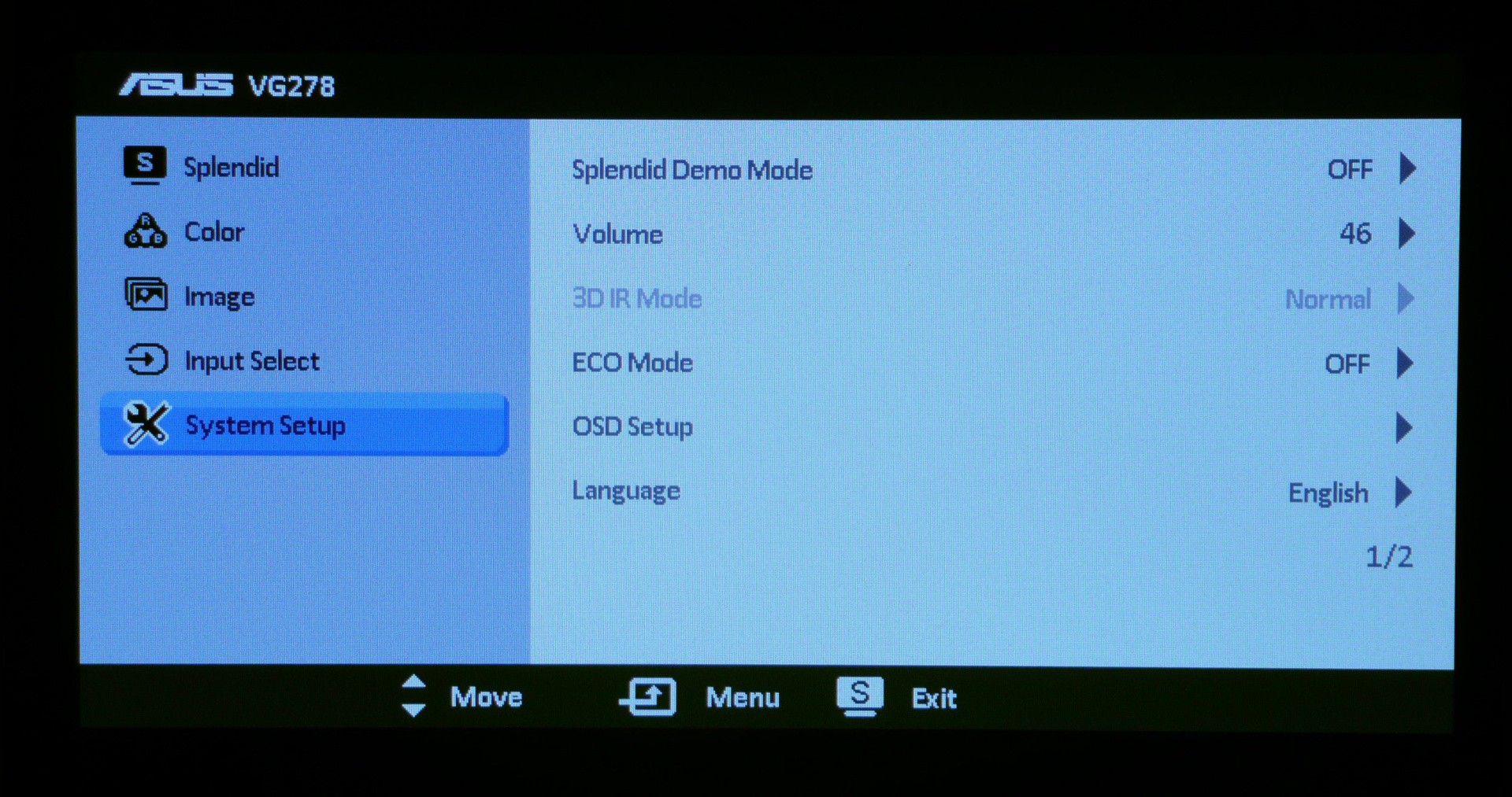The Color sub-menu allows for some tweaking on all other modes though - brightness, contrast, saturation, skin tones and colour temperature are all available for adjustment. A Smart View option here is designed to compensate for issues with viewing angles, but in practice it just seems to add a whole lot of brightness to the image while subtracting contrast - not hugely impressive, in other words. In 3D mode, NVIDIA Lightboost can also be adjusted but we found that it merely seemed to replicate the functions of the other brightness options, which are greyed out when stereoscopic content is in play.
