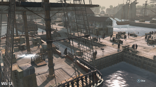 A remote play option is also available in the game's menus, which, once selected, allows play to carry on solely on the GamePad screen. This sets an impressive precedent for handheld gaming, though we find the compression algorithm used to stream the image across can break up certain flourishes of high detail in outdoor sections. This is where Nintendo's use of bright, clear colours in games like New Super Mario Bros. U reveals an advantage; the colour palette of Assassin's Creed 3 arrives slightly muted and grey, and some of the fine edging around tree branches can appear fuzzy for the moments following quick camera pans. It's a worthwhile feature that truly carries the broad scope of the game to the small screen, but it's sometimes best to not look too closely.