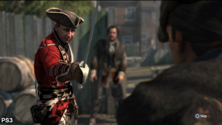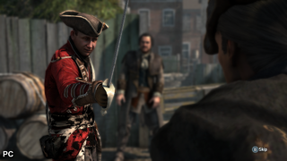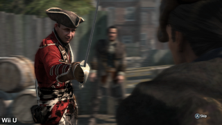 In fact, the Wii U's faithful delivery of Assassin's Creed 3 extends to the game's list of glitches. Even on patch v1.01, weighing in at 65mb, General Braddock's lips still don't move during part of his angry introductory speech - an uncanny moment in line with the other versions on their original playthroughs. Thankfully, we notice this appears to have been solved for the PC release. We also spot an intensified depth-of-field effect on Wii U (pictured above), which overlaps onto the characters in focus at the time, likely counting as a glitch in its implementation.