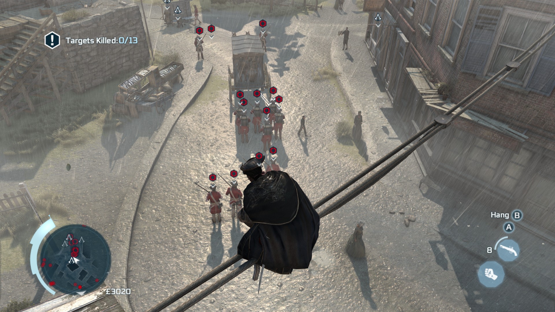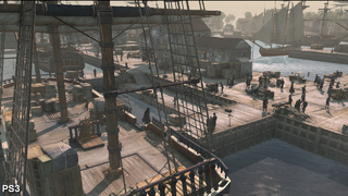 Excluding a few scenes, such as Haytham writing alone in his cabin, the frame-rates for all three platforms tend to stick close together, wherever they may travel. We see equivalent dips down to 20FPS while doing a leap of faith, for example, likely as a result of new geometry and NPCs quickly streaming in as the character zooms to the cart below. It's a respectable turnout for the console, but on average the Wii U does appear to drop frames at a slightly higher rate than the other platforms.