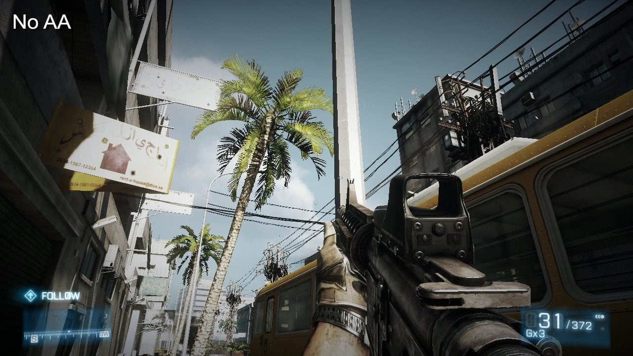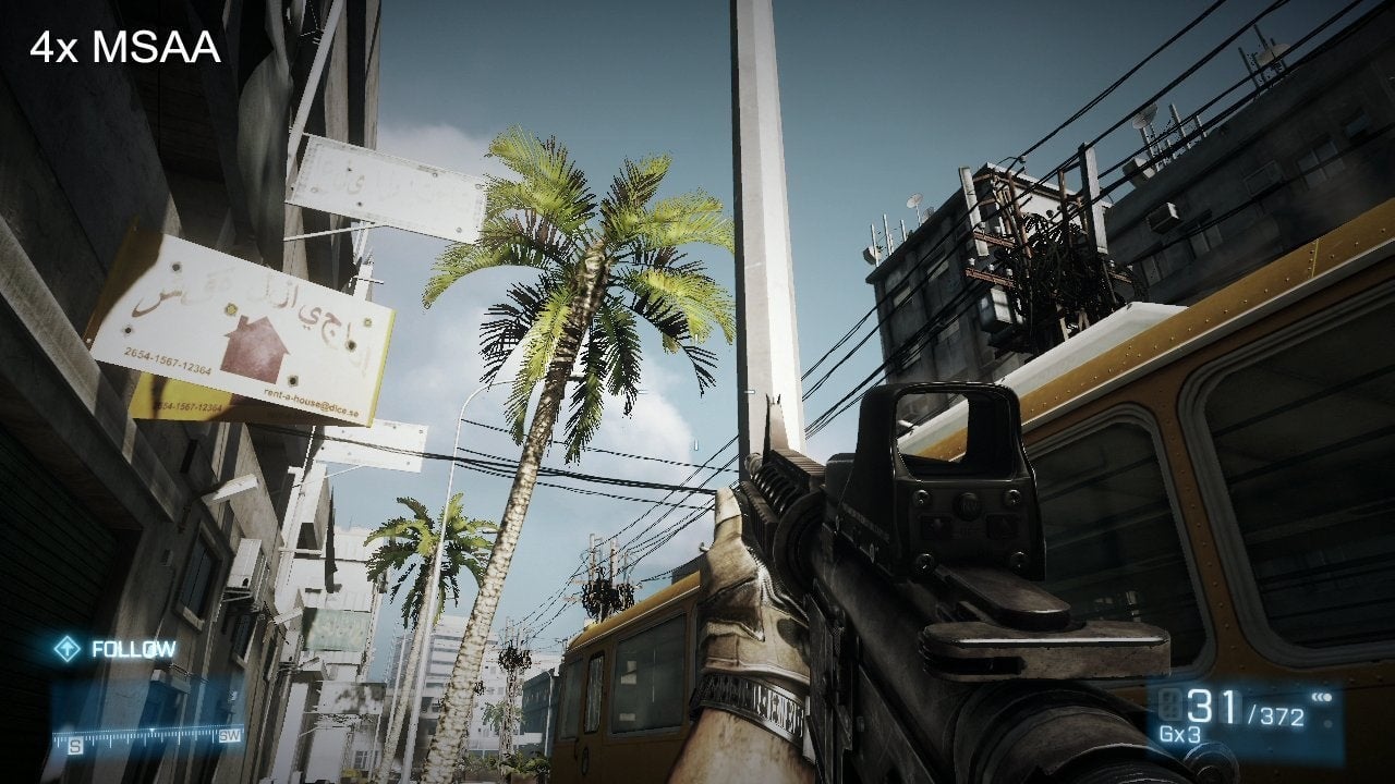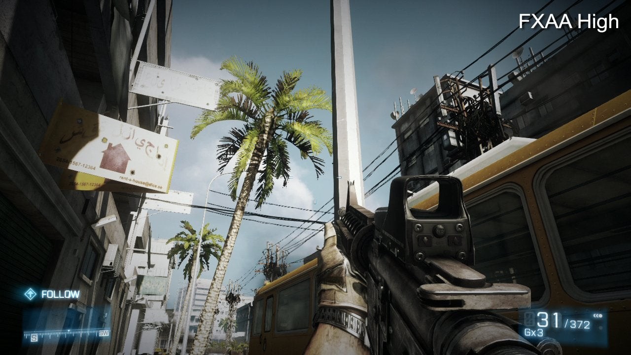 There are subtle drawbacks to using HDR post processing such as this, however, as it is factored in at a much later stage in the processing cycle. In particular, this has an impact on the effectiveness of conventional Multi-Sample Anti Aliasing (MSAA), which is oblivious to how the final image is effected after its application. This is where DICE's inclusion of Fast Approximate Anti Aliasing (FXAA) option in the graphics settings becomes relevant. As another form of post-processing that functions at a pixel level, it can soften the high contrast edges left on decorative elements such as fences or foliage.
