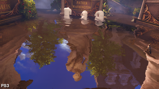The level of detail is further amplified on the PC through higher-quality normal maps and greater geometry complexity in parts of the environment. Statues feature more angular curves that project better defined shadows across the surrounding surfaces, while small bumps and cracks are given an extra layer of three-dimensionality over the same surfaces found on consoles. On the other hand, there's little to separate the PS3 and 360 releases from each other: textures and normal maps are a close match, although we find the level of filtering to be a little higher on the PS3, adding a touch more clarity in some places. Shadows are rendered in slightly higher resolution on the 360, while an off-set bias causes some lights and shadows to appear in different places on PS3, with elements such as specular sheen and lighting bloom dialled back slightly as a consequence.