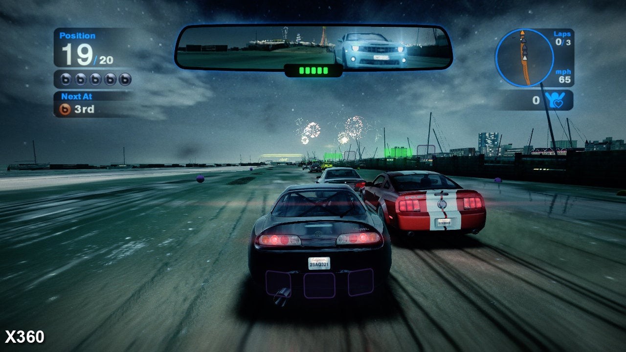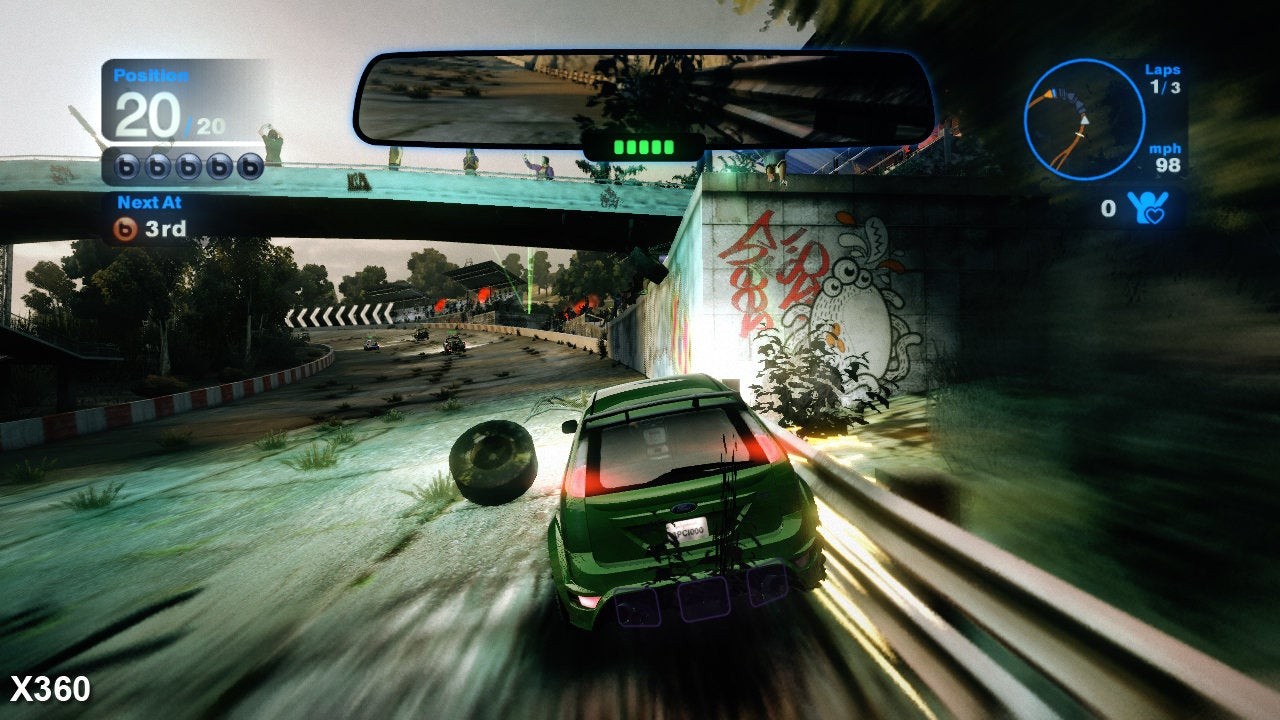 This is the only major point of differentiation in terms of the look and feel of the game when comparing to the PlayStation 3 version. It's rare that we see 4x MSAA implemented on PS3 at all, and in terms of your AAA driving games, only Gran Turismo 5 Prologue possesses it. In cross-platform fare, 4x MSAA on 360 is often substituted with quincunx AA (QAA) on PS3, but for Blur Bizarre has opted for 2x MSAA with a half-pixel, bilinear-filtered edge blur.