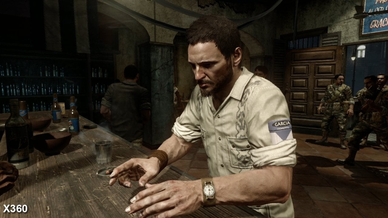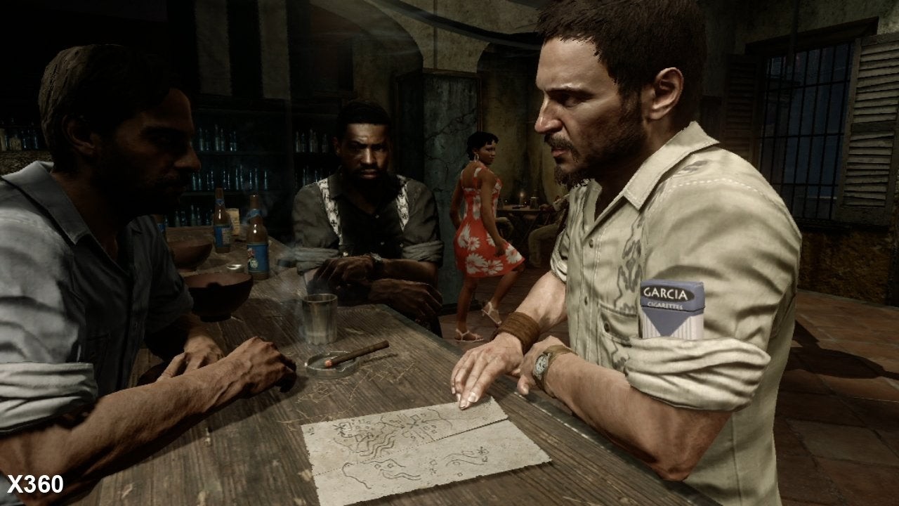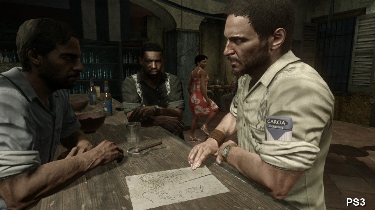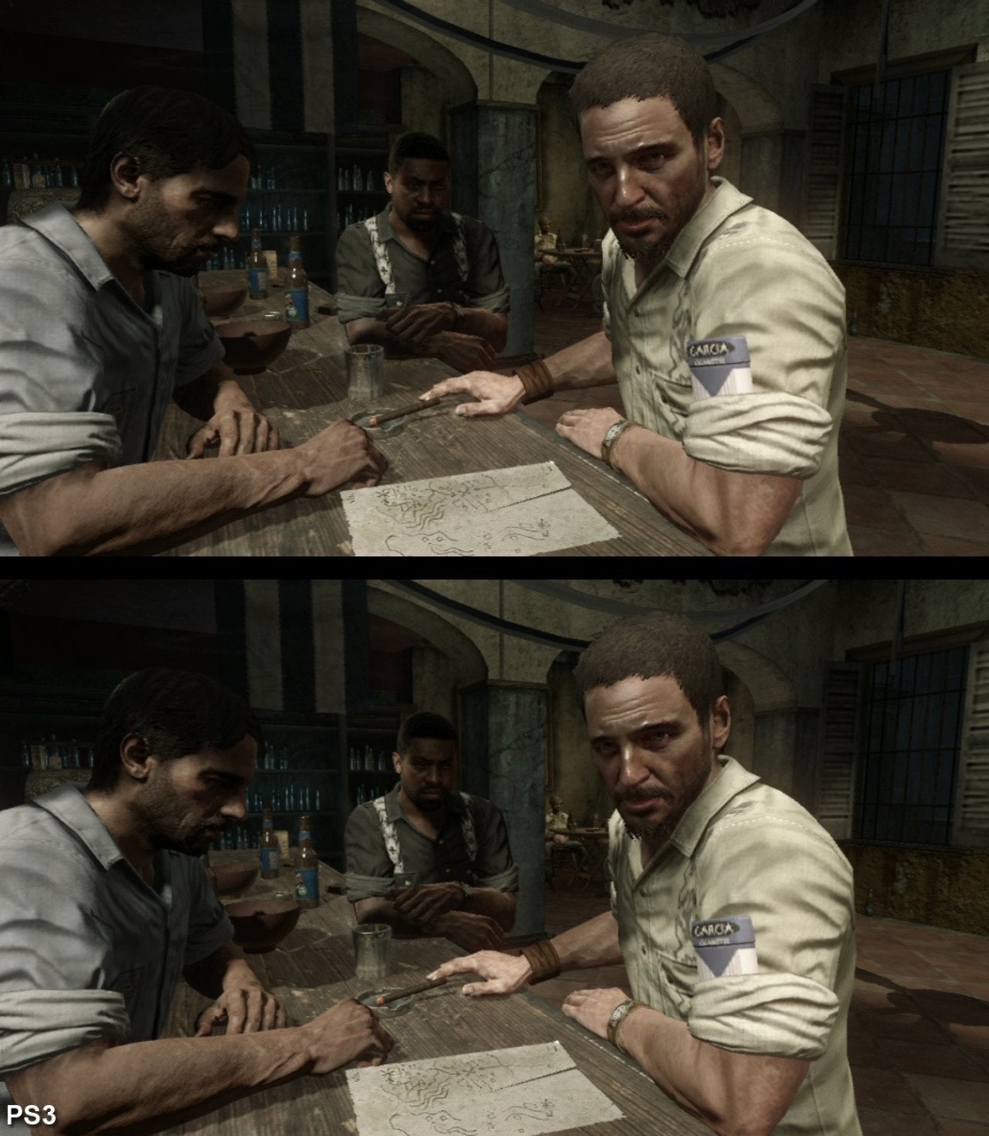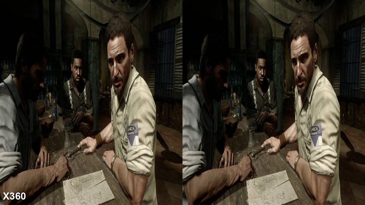 There are some visual differences in other areas of the game. Looking across our captures, we can see instances where the PS3 or 360 versions appear to be running with lower-resolution textures. In many cases this is probably down to the background streaming with the higher-resolution art transitioning in. In other areas, it appears to be down to small bugs in the rendering. In the very first scene on PS3 we see Woods' cigarette packet transitioning from what seems to be a high-res texture into a lower-res one, while the same art remains consistent on 360.