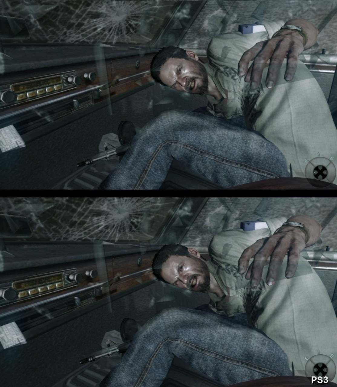 In theory, the PlayStation 3 commands the advantage here as there's literally double the resolution being transmitted from the HDMI port. In practice, though, it seems to be the case that, despite the HDMI 1.4 output format, the image is still being squeezed horizontally in much the same way as the Xbox 360's, the difference being that the console is doing the scaling rather than the screen. If we overlay an expanded 360 screen over the equivalent PS3 image, we can still seem to see more detail being resolved.