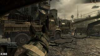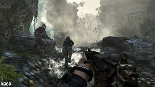 With Infinity Ward back at the helm, Xbox 360 owners are in familiar territory with an approximate 1024x600 framebuffer favoured by the developer's previous Call of Duty titles, while the PS3 version features a considerably murkier presentation more closely matching that of Black Ops 2, with native resolution coming in at just 860x600, resulting a soft-focused image. The use of 2xMSAA is present on both formats, and the technique tames some of the harsh edges that appear on-screen to a degree, at least on chunkier details. Sub-pixel crawling still is a common occurrence in both versions on distant objects, though, with artefacts appearing more prominently on the PS3 where the MSAA algorithm tends to break more often.