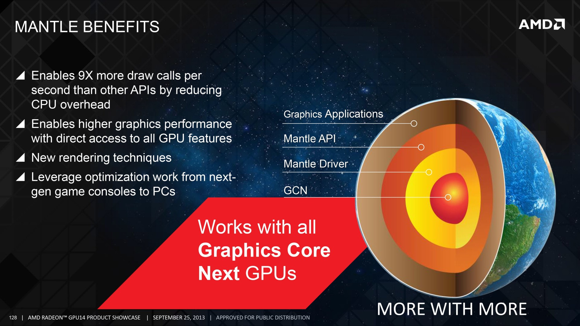 "Mantle, an AMD initiative to create a new graphics programming model that fully exploits the capabilities of modern GPUs, allows game developers to speak the native language of the AMD Graphics Core Next (GCN) architecture, providing a deeper level of hardware optimisation no other graphics card manufacturer can match," AMD said in a statement. "As part of this initiative, we have worked with leading game developers to create an API specification and associated graphics driver that enables this model on PCs with GCN-based graphics hardware. Mantle was created in direct response to requests from leading game developers, so interest is very high."