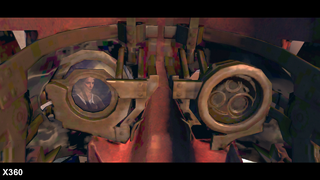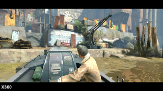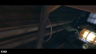 Bizarrely, textures on 360 look more compressed than on PS3 at points. At its most prominent, we see crude bands of green and purple play across surfaces which are otherwise perfectly clean on PC and PS3. To put this into perspective, we have the 360 version installed to its HDD, while the PS3 plays off its 20-minute mandatory install. Even after all assets have finished loading up, we still notice this strange artifact over specific objects on the 360 version, such as the metallic interiors to boats or the inside of Corvo's red mask.