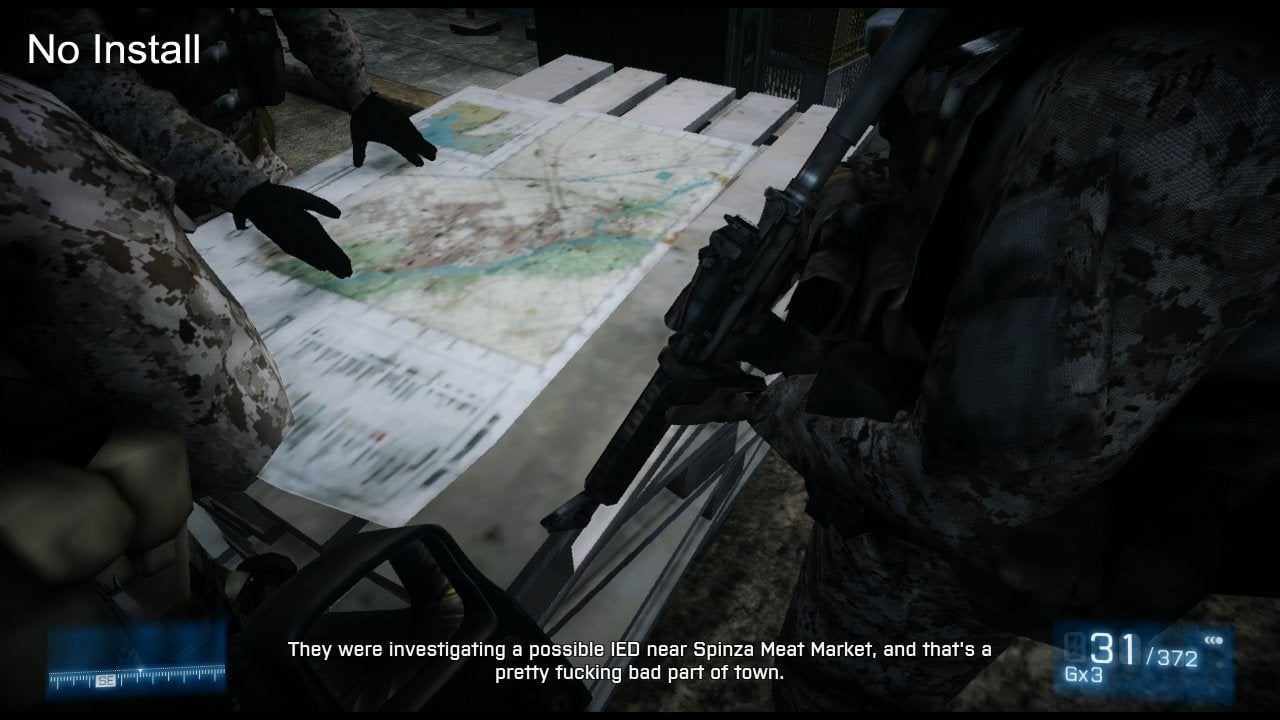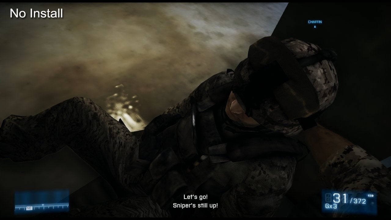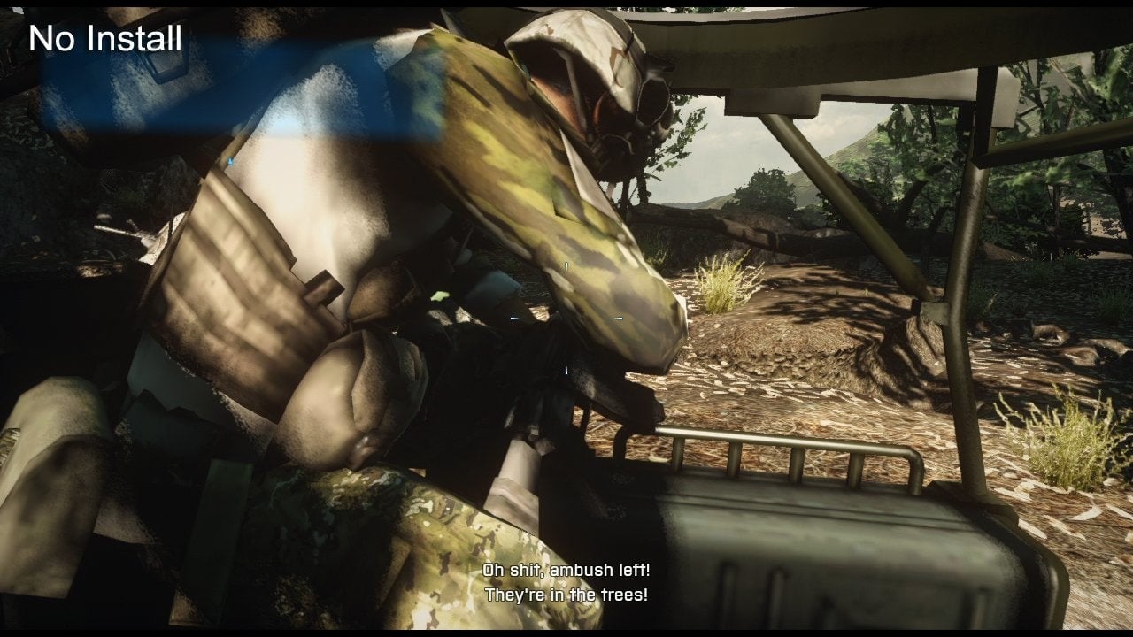 Just how sub-par the uninstalled Battlefield 3 actually looks is worth looking at. We've seen it described elsewhere as looking like a PS1 game. First up, it's worth bearing in mind that only texture quality is affected here. Despite being described in terms of "SD" and "HD", the native rendering resolution of the game is unaffected: all that is missing is some of the higher resolution texture assets. That being the case, describing it as looking like a PS1 game (as we've seen this week elsewhere) is bordering on the criminally insane. Let's re-run some of the campaign cut-scenes and take a look at how they stack up with the install and without.