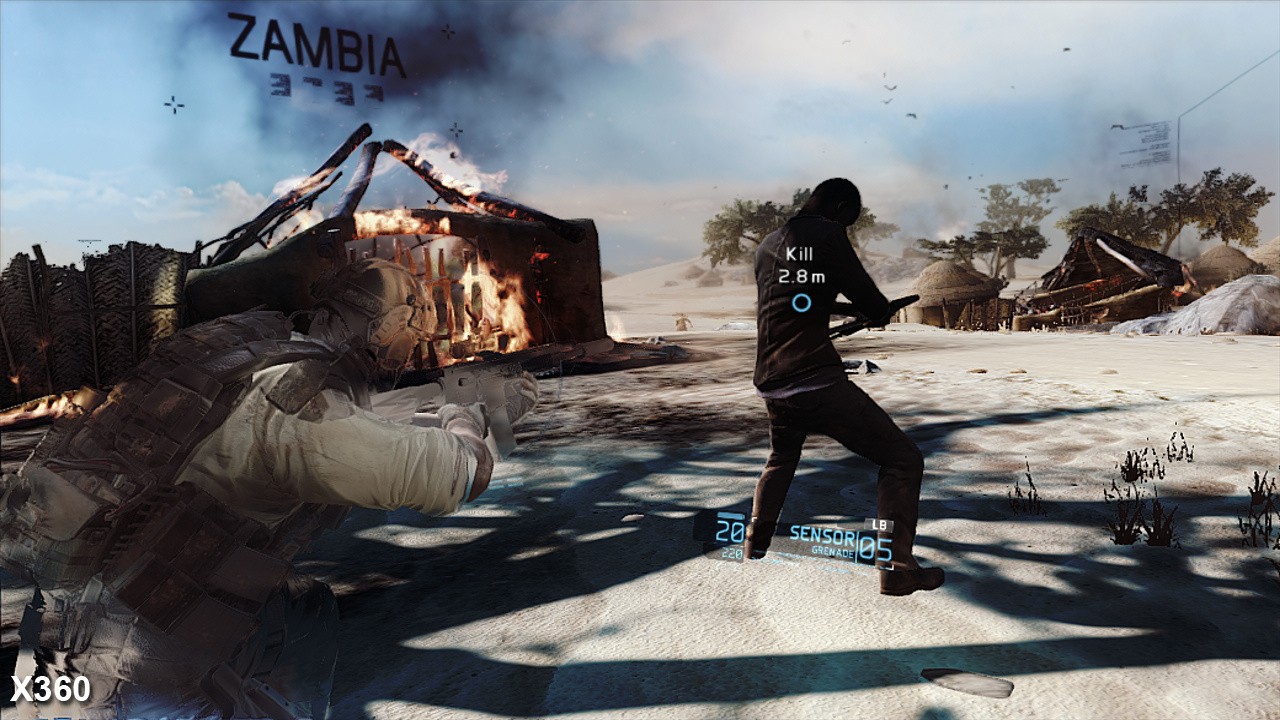 Lighting is another huge distinguishing point. Each version's illumination falls across characters in varying ways, and as a result, shadows can cast off in radically different directions. This leaves some cut-scenes looking far more dramatic on PS3, and sometimes moreso on 360; in one explosive scene during the Nigeria stage we see light shafts trailing around a character's shoulders on 360 simply because the sun happens to be positioned behind them. On the other hand, abseiling downhill during the prologue mission reveals a noticeably higher level of shadowing around plants on PS3.