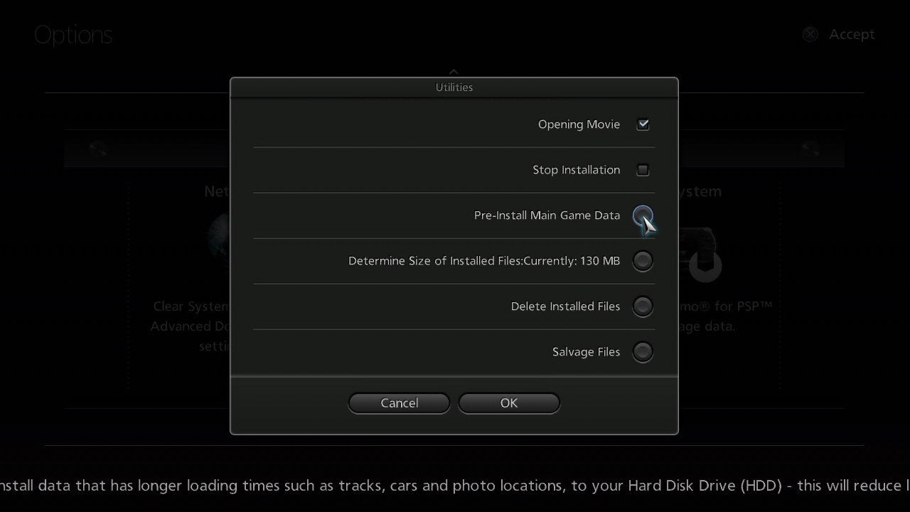 If the size or time-scale of the install puts you off, Sony rightly points out that you can play GT5 without installing the game data and that only a minimal amount of leftover space on your HDD is actually required to get up and running. However, it is noteworthy that with the 1.01 patch update, the game brings up a prompt strongly recommending that you carry out the optional install.