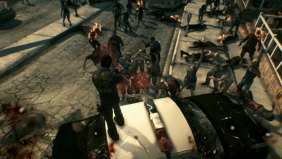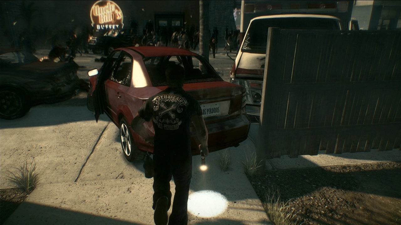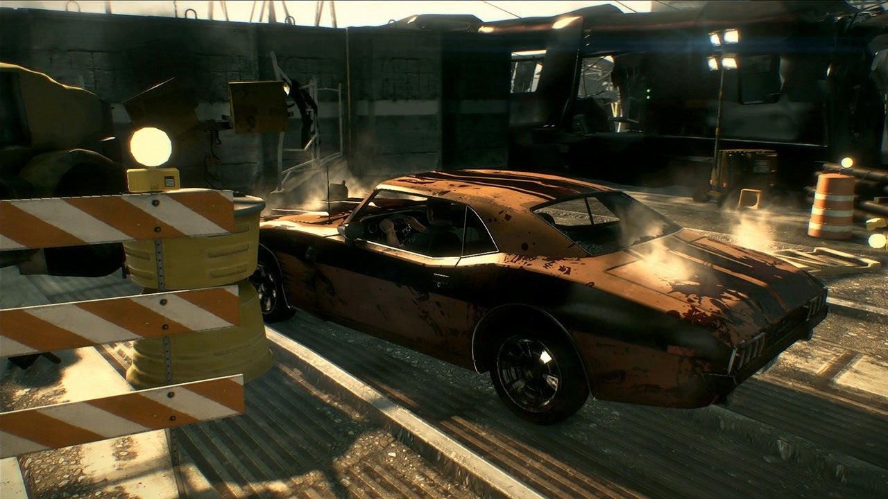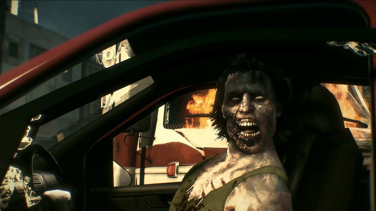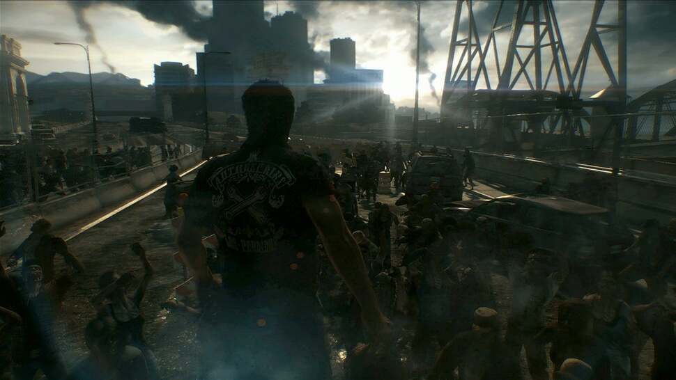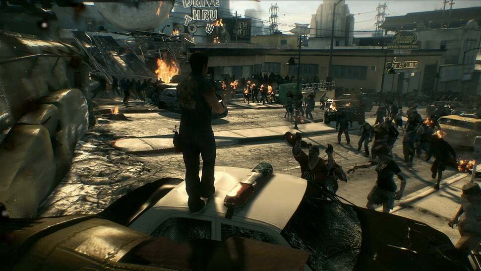 There's no confirmation on resolution, but from what we saw, it's not far from 1080p in terms of clarity. God rays and motion blur are implemented, but in a very subtle manner. Camera-directed flashlights operate much like Silent Hill: Shattered Memories while inside, producing strong, atmospheric stencil shadows, which also demonstrate a huge improvement to reflection mapping on the player's suits. While outdoors, Dead Rising 3 has a few issues with streaming the environmental elements quickly: one particular scene has us driving full-pelt through a zombie-infested cemetery in a hearse, where a gazebo suddenly pops in only a few metres away.