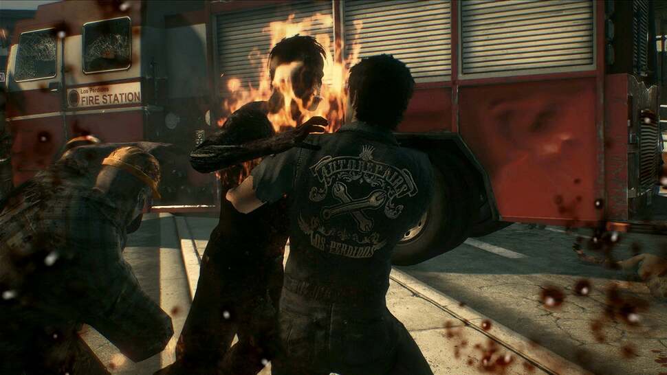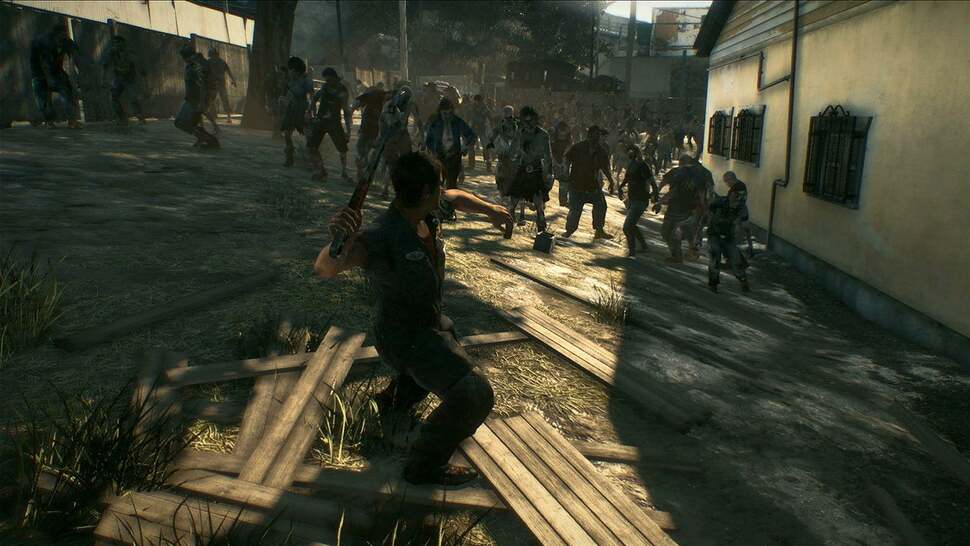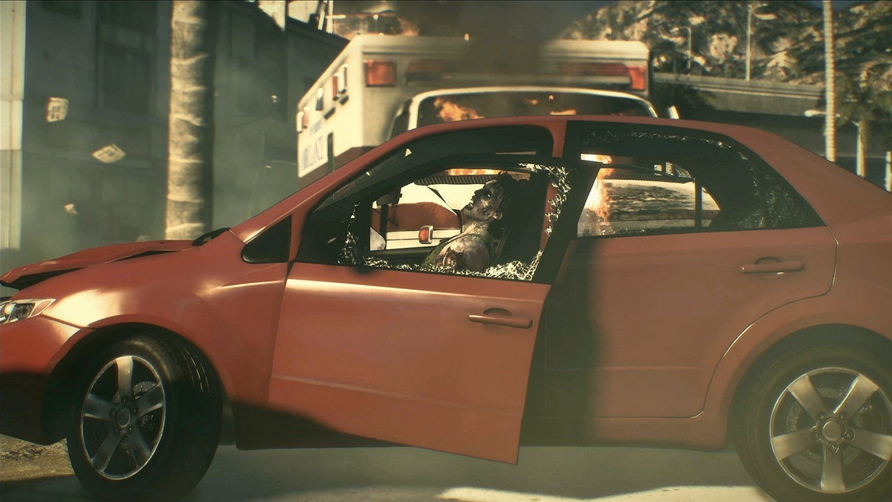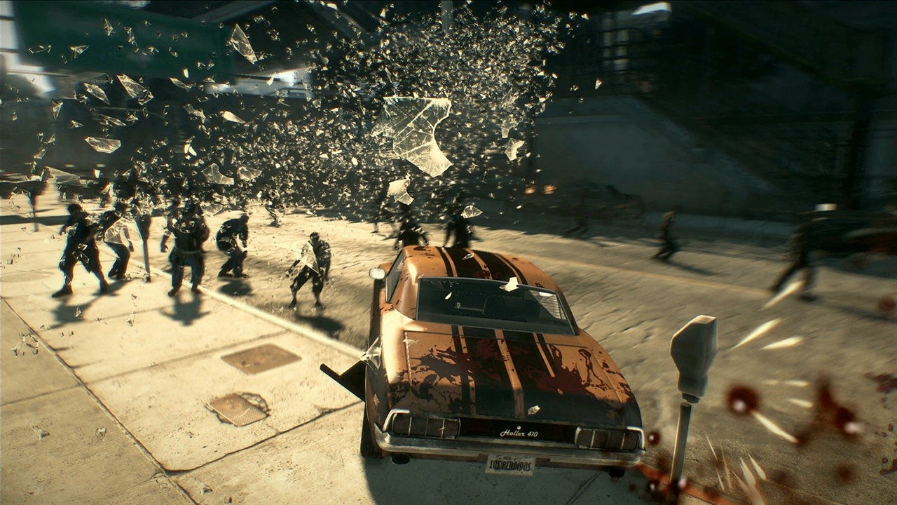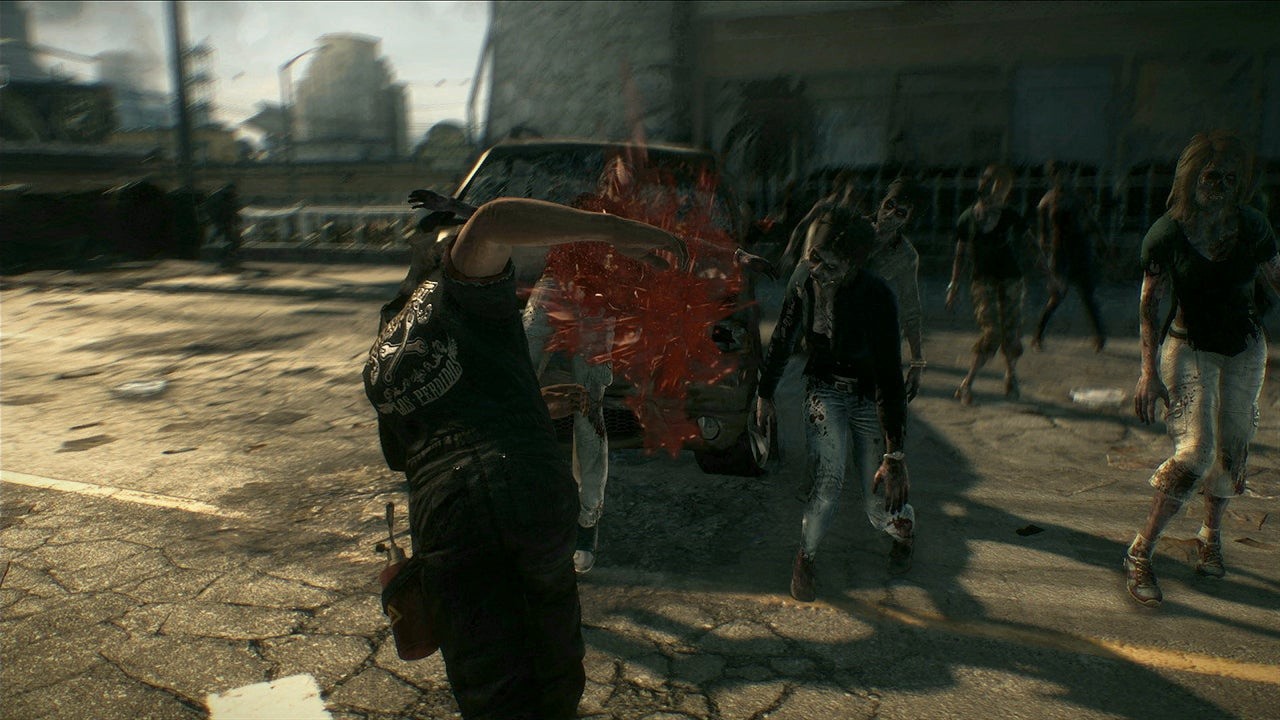 There's no confirmation on resolution, but from what we saw, it's not far from 1080p in terms of clarity. God rays and motion blur are implemented, but in a very subtle manner. Camera-directed flashlights operate much like Silent Hill: Shattered Memories while inside, producing strong, atmospheric stencil shadows, which also demonstrate a huge improvement to reflection mapping on the player's suits. While outdoors, Dead Rising 3 has a few issues with streaming the environmental elements quickly: one particular scene has us driving full-pelt through a zombie-infested cemetery in a hearse, where a gazebo suddenly pops in only a few metres away.