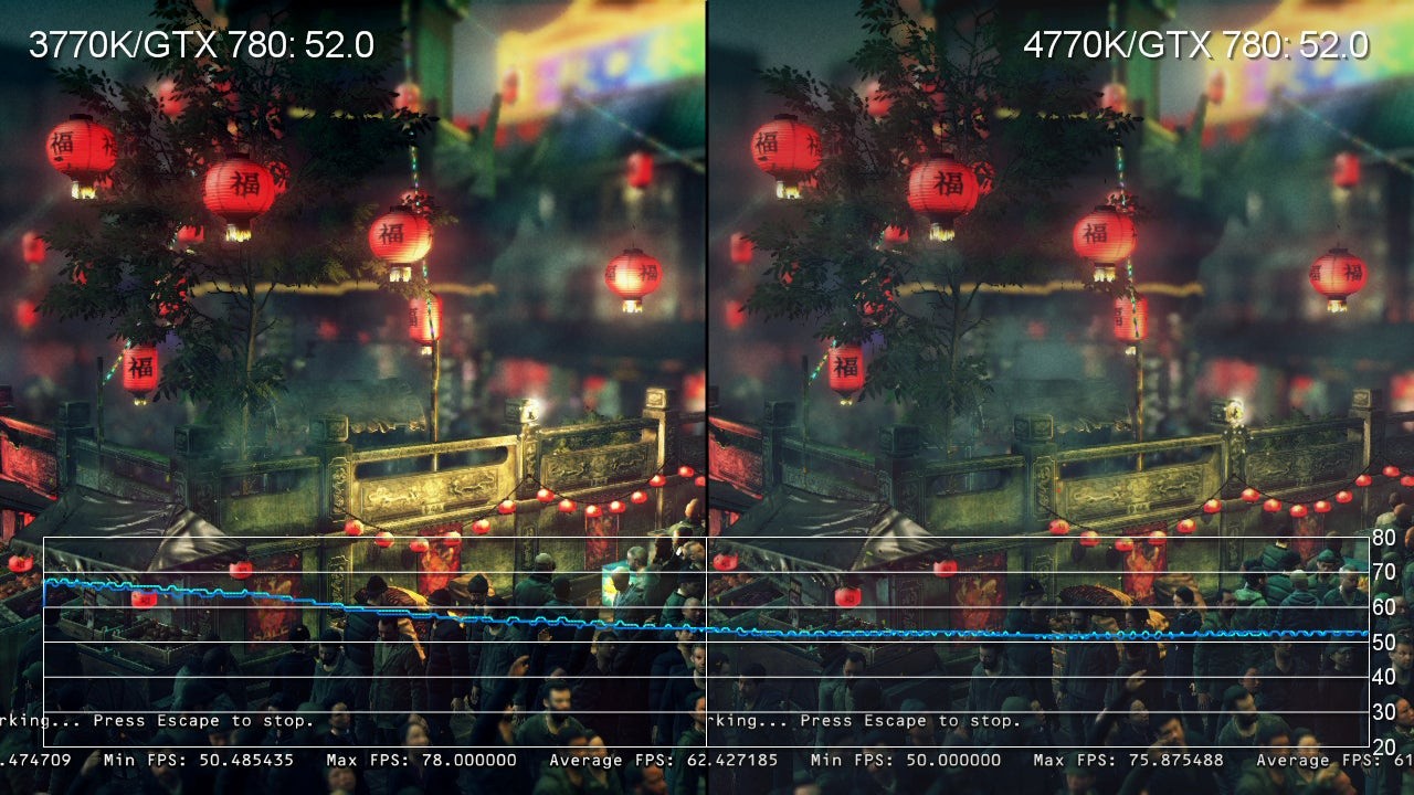 We opted for a compromise - very high settings at 720p resolution, removing any form of bandwidth intensive anti-aliasing (like multi-sampling AA, for example) from the equation. The idea here is that the CPU still gets a work-out at max settings, but hopefully we won't end up being artificially limited by the GPU. In terms of graphics hardware, we chose the best card at our disposal - the Nvidia GeForce GTX 780. The next challenge is to acquire accurate metrics. Historically, Digital Foundry has relied upon captured video because we trust the output of the PC more than the internals tracked by FRAPS (something PC tech sites are beginning to recognise).
