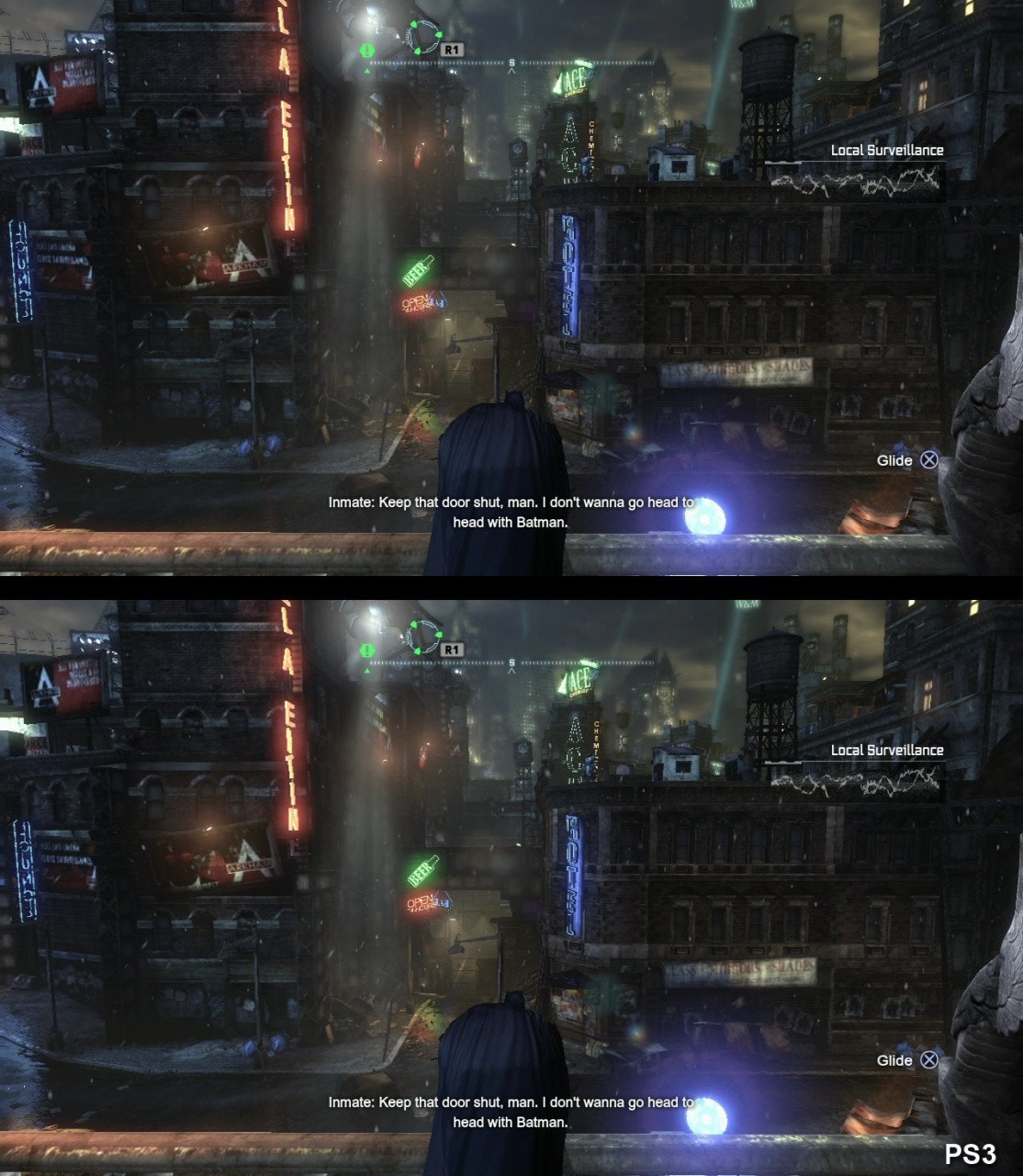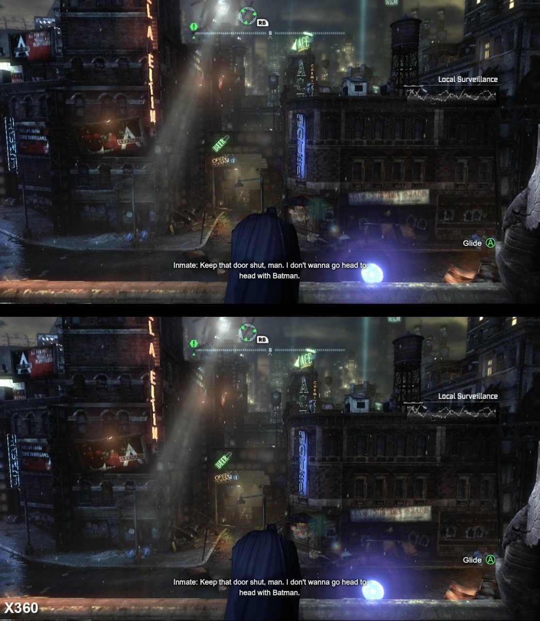 In terms of Arkham City itself, the game uses the same TriOviz technology as Gears of War 3 - though the Epic title was restricted to the half-res side-by-side functionality we've seen on other 360 stereo 3D games. Curiously though, while both games seem to be operating at native 720p on both platforms - as we would expect - the Xbox 360 version seems to have a one pixel wide blur across the whole image.