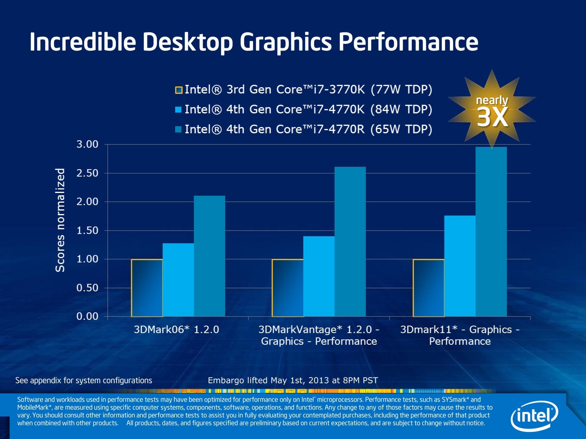 The Pro-level part really flexes its muscles in the desktop arena, where clock speeds are significantly increased and where there's much more thermal headroom. Intel's 3DMark 11 testing suggests a 3x performance boost over the HD 4000 graphic tech found in the current third gen Core "Ivy Bridge" processors when comparing the existing 3770K to the new 4770R, while the new 4770K gets a 1.8x increase. So what's the difference between the "R" and "K" offerings? Well, only the "R" chips get the eDRAM, the traditional "K" processors utilise existing system RAM, giving some idea of the performance boost the dedicated memory offers (and perhaps by extension, why Microsoft needed it for its next-gen console with GDDR5 off the table).