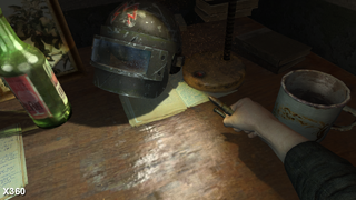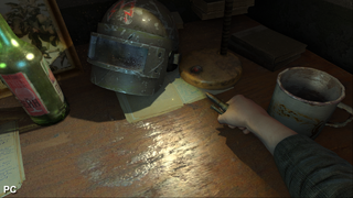 The series' signature lighting is noticeably more refined on PC too, with accurate light interaction across materials such as glass and metal plates. Compared to the implementation on console versions, this allows light to diffuse naturally through items such as translucent green bottle, with light scattering across the surface to cast a coloured tint. A look at Artyom's busy desk-space also shows the table's varnish reflecting his lamplight with a crisper focal point, while his gas mask visor reveals more accurate reflections of the other table contents.
