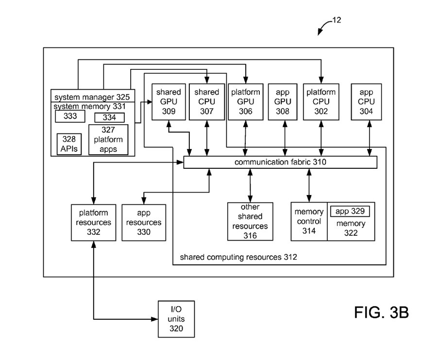 The principle idea behind the patent is in providing a framework for integrating "platform" and "application" processing into a single system where both systems can run concurrently, but the overriding concept is the scalable architecture that allows for more advanced hardware revisions (with improved CPUs or GPUs for example) to be rolled out over time. One diagram even adds a third CPU/GPU set-up - shared processors that can lend a hand to the other two, for reasons unknown.