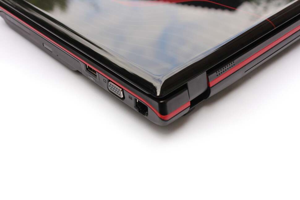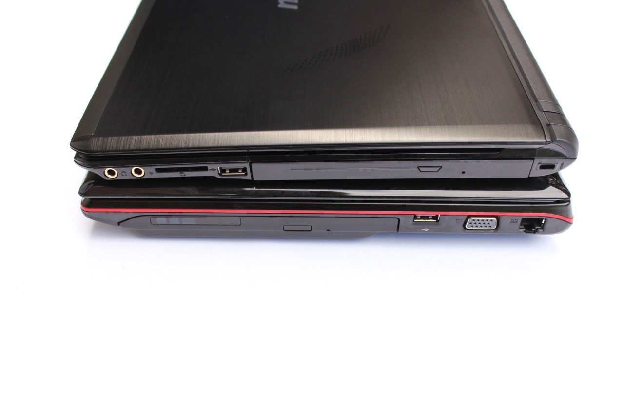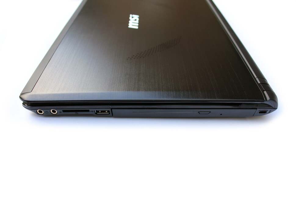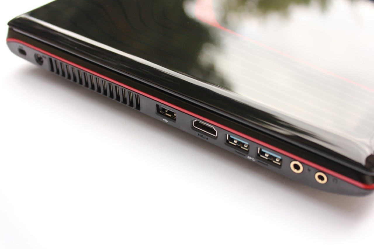 The GE60 adds some flair to its design by splashing red sports lines across its lid and rim, while a glossy piano lacquer finish is used for the shell. Again, it's a nightmare to keep on top of fingerprints while opening and closing the unit, to the point where it becomes more hassle than it's worth to keep a cloth handy. On parsing open the laptop we touch on a distinctly rough edge to the top of the lid, as if the matte bezel and glossy plastic for the exterior are misaligned at the meeting point by a millimetre. Even so, the cool metallic finish of the insides is a big upgrade over the GE40s predominate reliance on plastics, and it still feels relatively lightweight given its contents include two SSDs, a single 1TB HDD, and an optical drive. In either laptop's case, the positioning of ports is similar, with the DVD-RW bay situated to the right side, and main heat vents planted to their back-left.