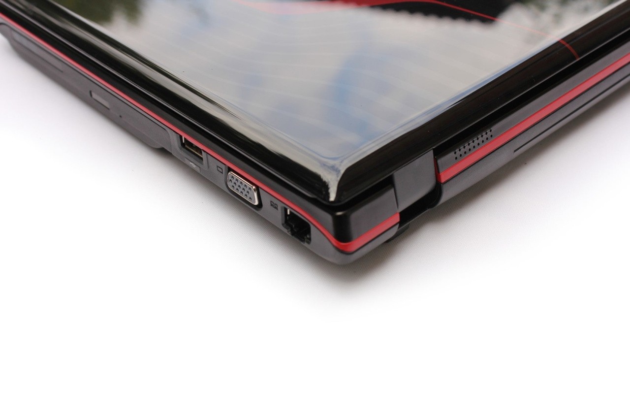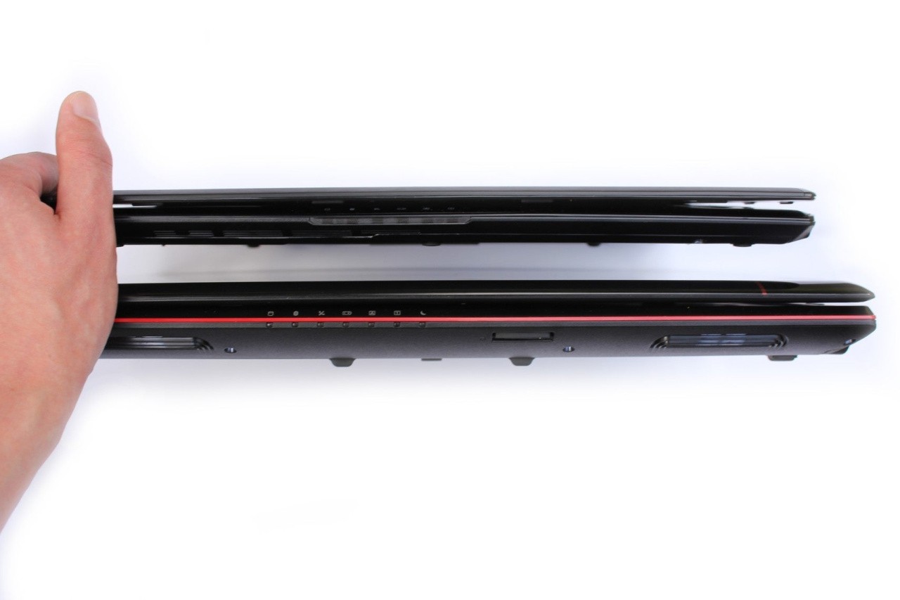 The physical design of the laptops has a huge bearing not on just on heat dissipation, but general usability for mobile gaming. Declared by MSI to be the thinnest and most lightweight gaming notebook, the GE40 crams these components into a chassis measuring under 30mm in thickness while closed, and weighing in at just 1.95kg in this configuration. There's some flex to its aluminium-brushed lid, and the use of glossy plastics on the inside cheapens the feel of the unit, whilst also making it very prone to finger-print smudges during use. Even so, the choice of build materials no doubt helps to meet its target in weight.