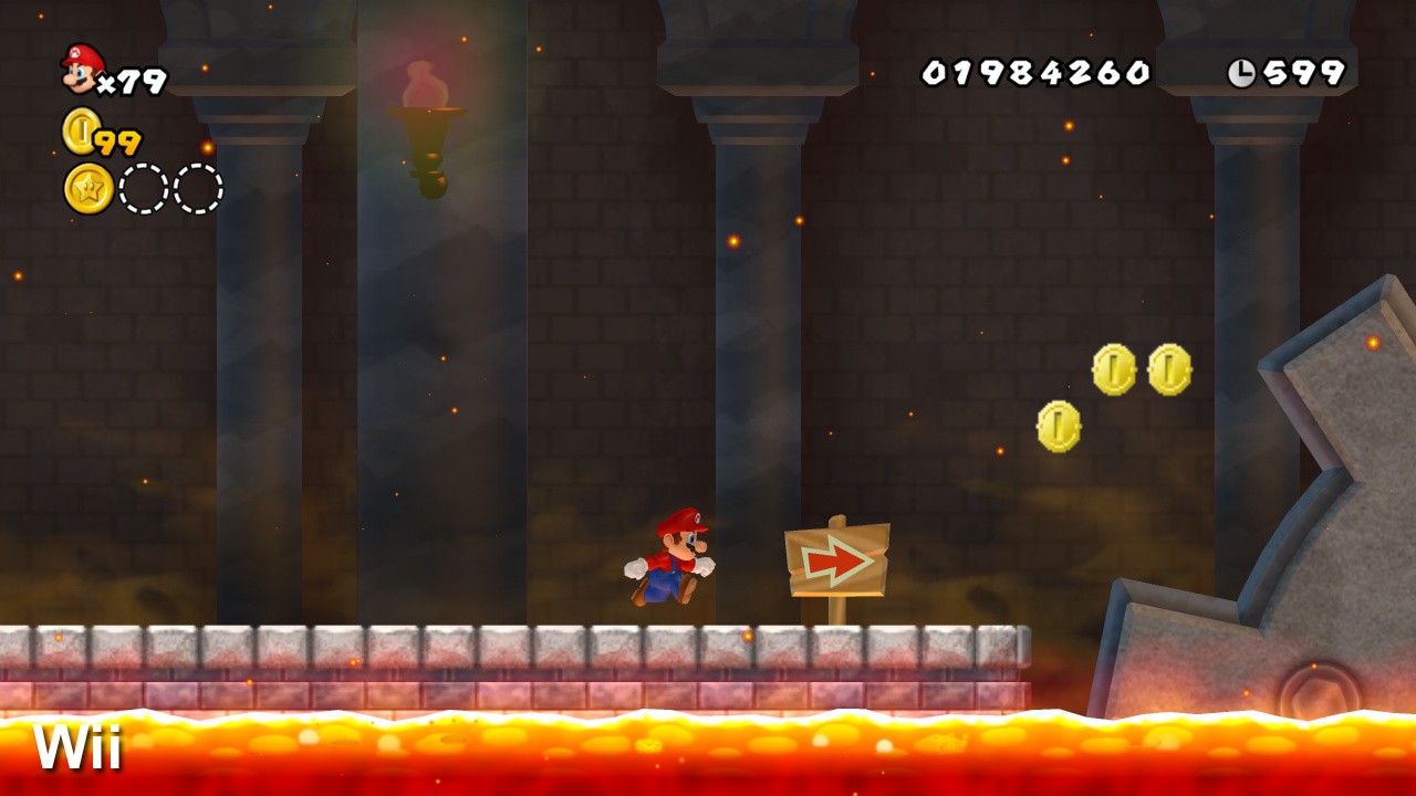 As far as interactive foreground elements are concerned, it's a mixed bag. The destructible blocks, green pipes and empty castles of the Mushroom Kingdom are as simplistic as ever, but are noticeably sharper than the emulated Wii version's. Other elements, such as the lava and water transparencies bubbling at the bottom of the screen, are carried over directly to the new version with only minor alterations.