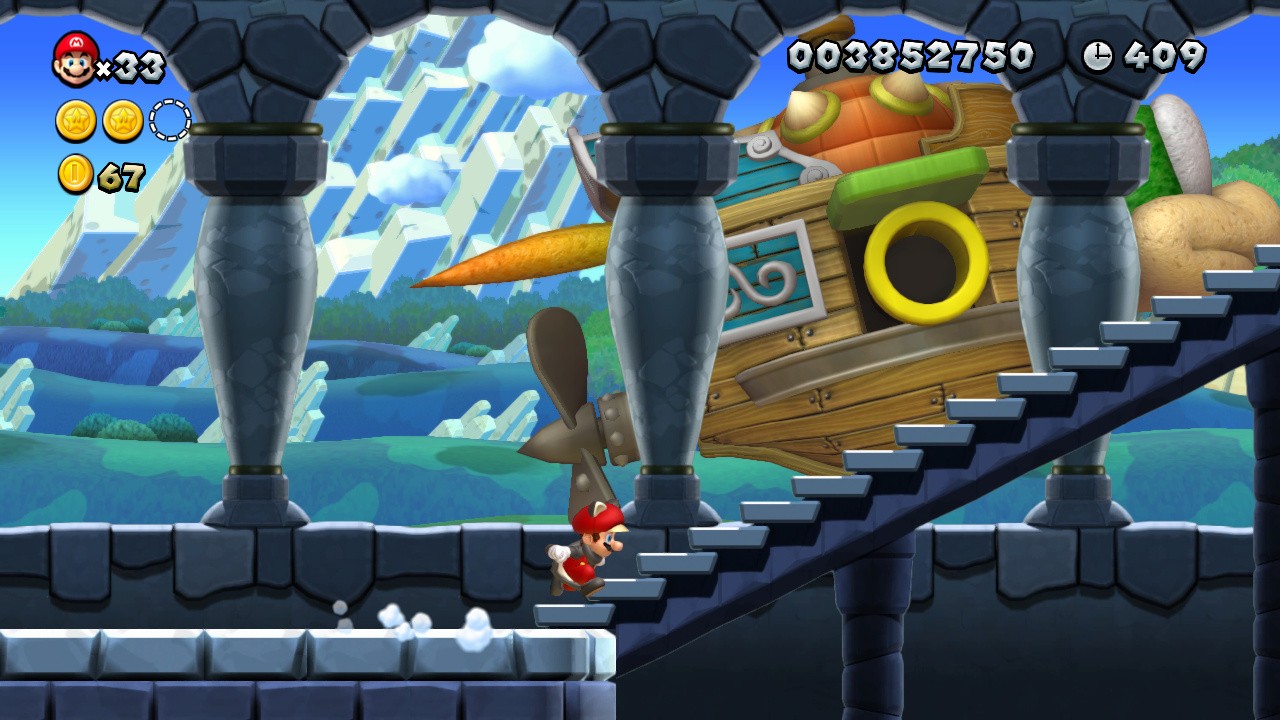 In this sense, the game is very conservative in its structure but tries to find freshness within its own parameters. Both it and its predecessor stubbornly hold to the same world progression, each running through the gamut of plains, deserts, icy glaciers, jungles, and mountain stages in much the same order. However, the interpretations of these themes can be unrecognisable at times with the Wii U version's backgrounds revealing fully animated waterfalls, flying enemy airships, and giant acorn trees surrounded by rolling clouds. A stronger sense of depth to the world is created behind Mario this time around, largely due to the more regular use of fully polygonal elements - such as the airships - which blend in convincingly with the other scrolling layers.