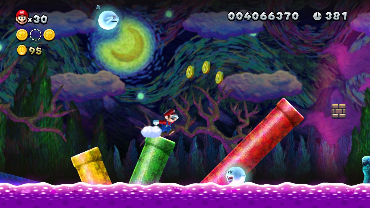 It's perhaps also a frustration that the visual styles Nintendo are touching on here - such as the Vincent van Gogh-inspired stage - aren't getting more breathing room, and that other styles of that extreme aren't represented in later levels. Nevertheless, modest as it is, New Super Mario Bros. U marks a promising technical leap forward over its predecessor; not just for the resolution boost up to 720p but also for the range of subtle visual tweaks that accompany it.