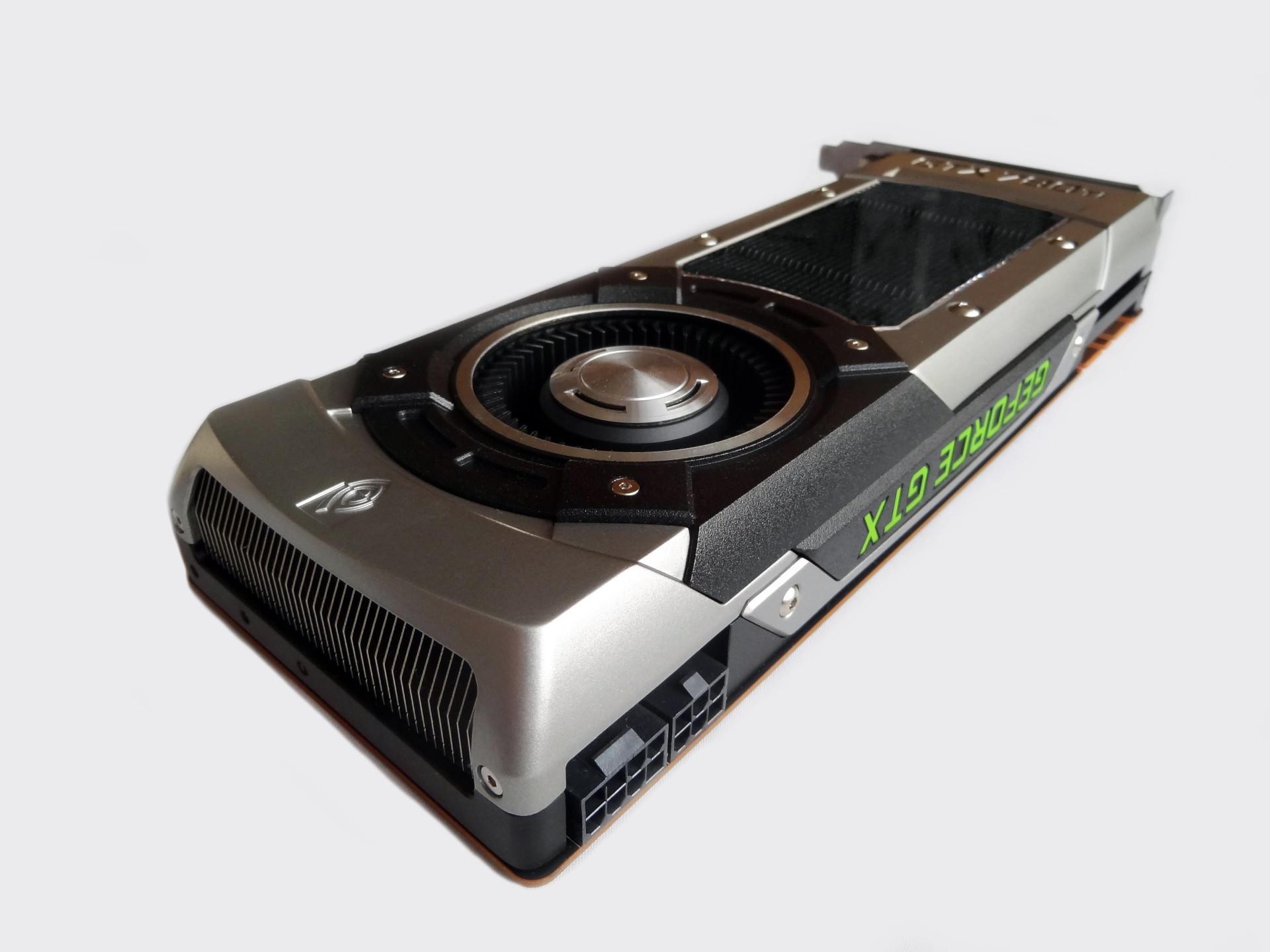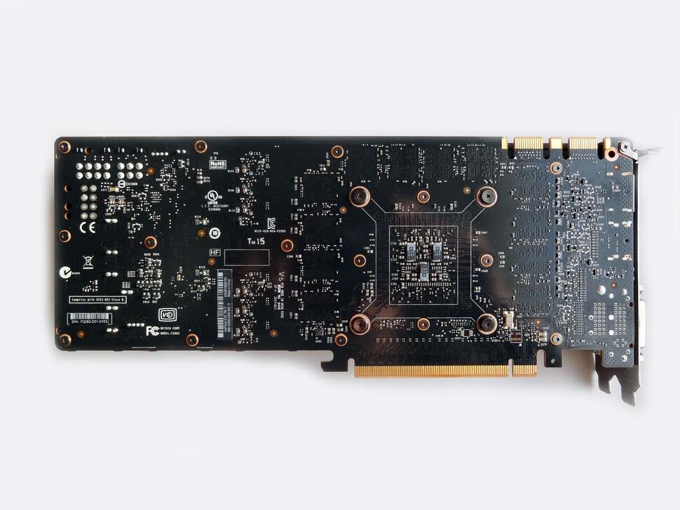 Rounding off the connection list are the power inputs on its top edge, the card demanding both 8-pin and 6-pin PCIe connectors to juice it. This is typical for cards of this bracket, where a maximum thermal design power (TDP) of 250 watts is also an expected concession. Fortunately, the high power requirement doesn't have a negative bearing on its heat and noise output in operation - certainly in comparison to its immediate AMD rivals. The cooling system stays largely inaudible even at peak performance, the fan speed subtly adjusting to avoid sudden, jarring changes in sound signature. This is a huge point in its favour compared to the obtrusive noise and heat of the R9 290 models, which are designed to stick to their maximum temperature of 95 degrees Celsius, resulting in a lot of fan noise.