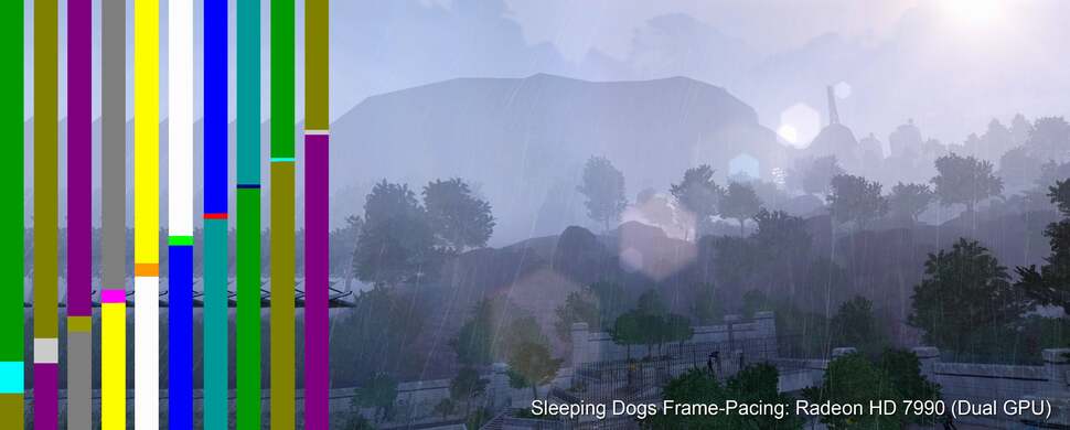 Even now, with a revised driver that seemingly resolves many of the issues, we still see some problems. If you look at the equivalent Sleeping Dogs frame sequence below, you'll see that a smaller slither of colour bisects two larger frames, getting smaller and smaller (increasing the stutter) until the frame is barely being displayed at all, with perceptual frame-rate almost halving. Just think: that little slither is actually an entire frame that the Radeon HD 7990 has generated, but barely gets any display time.