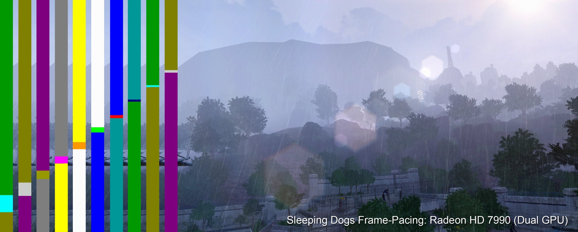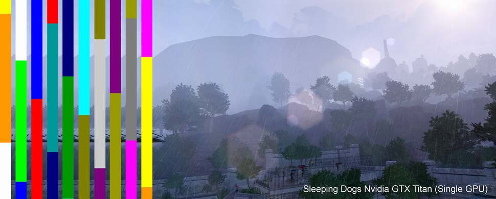That's why Nvidia created FCAT - a coloured overlay border that tracks each frame. In an ideal world, with a game running with v-sync disabled, FCAT results should look like the GTX Titan Sleeping Dogs result above (click the thumbnail for the full image - we realise it's a little small!). Here we've collated ten consecutive frames in a left to right horizontal stack so you can see the progression of frames from one image to the next by tracking the coloured border. You can see that each frame occupies a relatively even amount of display time, suggesting that the overall pipeline is working as it should. You'll get this with virtually any single GPU - it's not exclusive to Nvidia by any stretch of the imagination. While Nvidia emerged unscathed in its multi-GPU tests, the problem that AMD had with its CrossFire set-up was that the pacing of each frame could be a real problem.