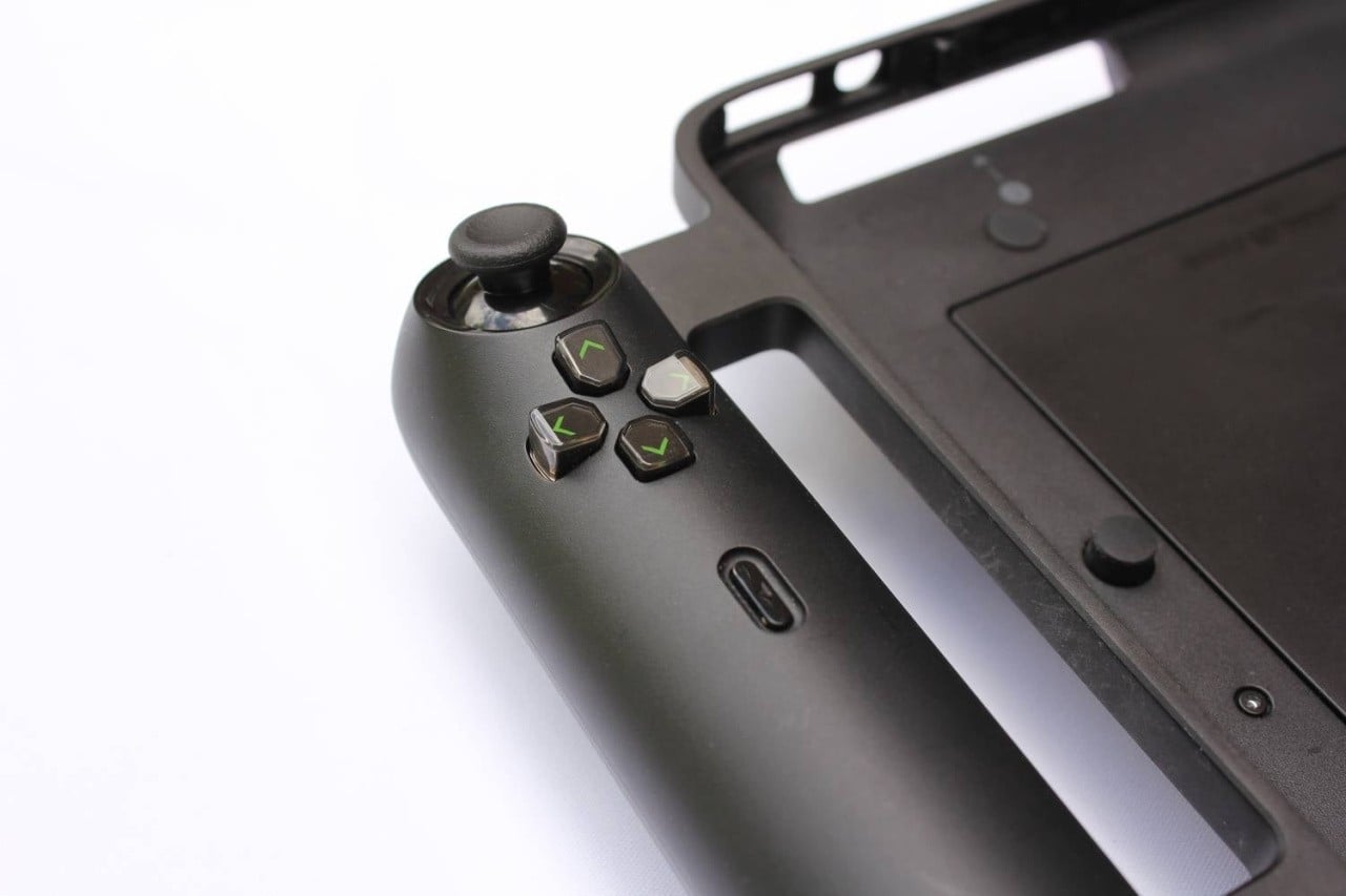 Looking at inputs, on the bottom of the device is a single 40-pin connector for charging, with divots for connectivity to accessories. Elsewhere, at the top edge is a single green USB 3.0 port, a headphone input, volume rocker, plus dedicated buttons farther along for activating a virtual keyboard, and locking screen rotation. The availability of a physical button for the keyboard is welcome, since the OS doesn't always bring a virtual keyboard up after tapping search bars, or during games which require it only briefly. Having a screen-rotation lock is also a smart move for a game-centric device, given how accidentally switching to vertically orientated resolutions rarely goes down well with most FPSs.