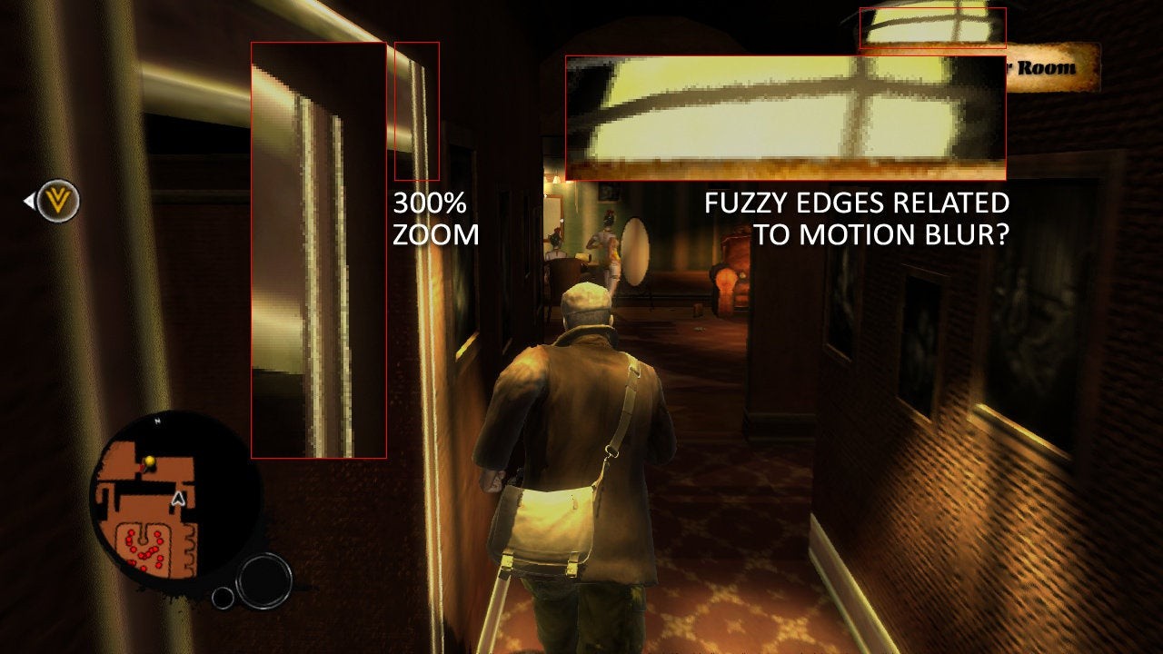 Pandemic is keeping mum on the AA technique, though some tidbits have apparently leaked from the developers on the NeoGAF forum. According to these posts, the filter is applied to the luminance of any given scene. It's a really clever way to maintain speed, but on the other hand, some colours - red and black for example - have similar luminance levels, so the filter picks up the majority of edges but misses others. Additionally, in some cases there are some interesting "fuzzing" issues on edges, which without some more illumination from the coders is very difficult to explain. Perhaps it's simply the effect of processing a motion-blurred screen?