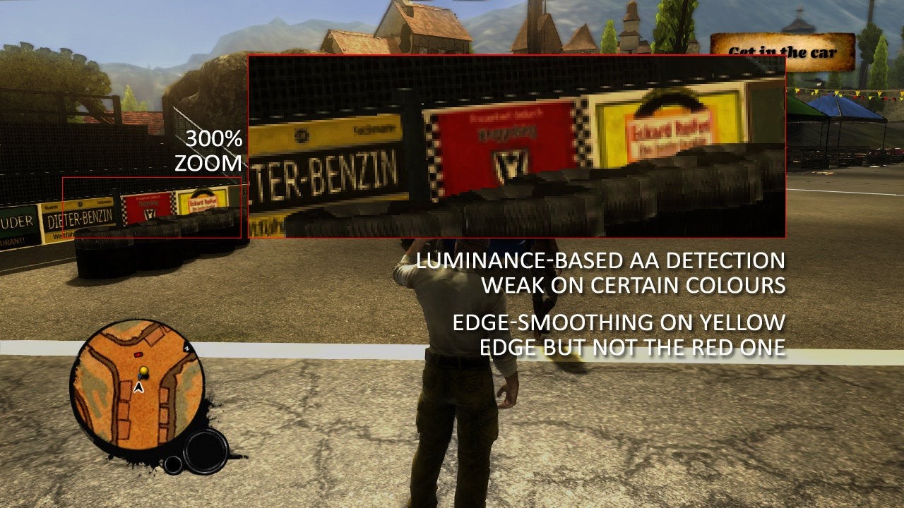 In terms of the effectiveness of luminance for determining edges, Christer also pointed out that the pixels we've highlighted as causing problems for edge-smoothing in The Saboteur aren't a product of red meeting black, but actually brown and red - similar in terms of luminance values and thus more likely to cause that particular artefact.