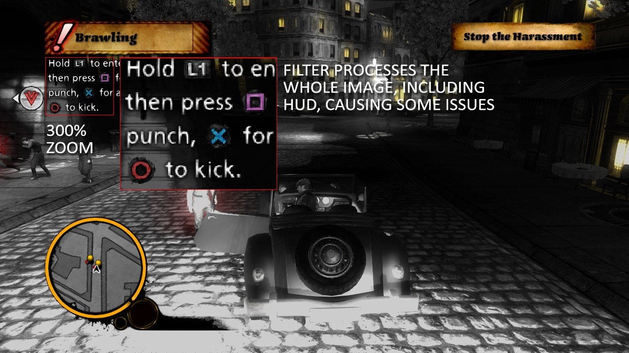 Being experimental, it does have its drawbacks. When edges in-game are one pixel or less than one pixel in thickness, the edge-detection technique doesn't really work. Pandemic also subjects the entire, completed framebuffer to analysis - including the HUD elements - so there is often artefacting on the text overlays. This is probably unavoidable in this game: while the GPU starts to draw the next frame, the SPUs are busy with the AA and for that situation to take place the completed frame will need to be analysed.