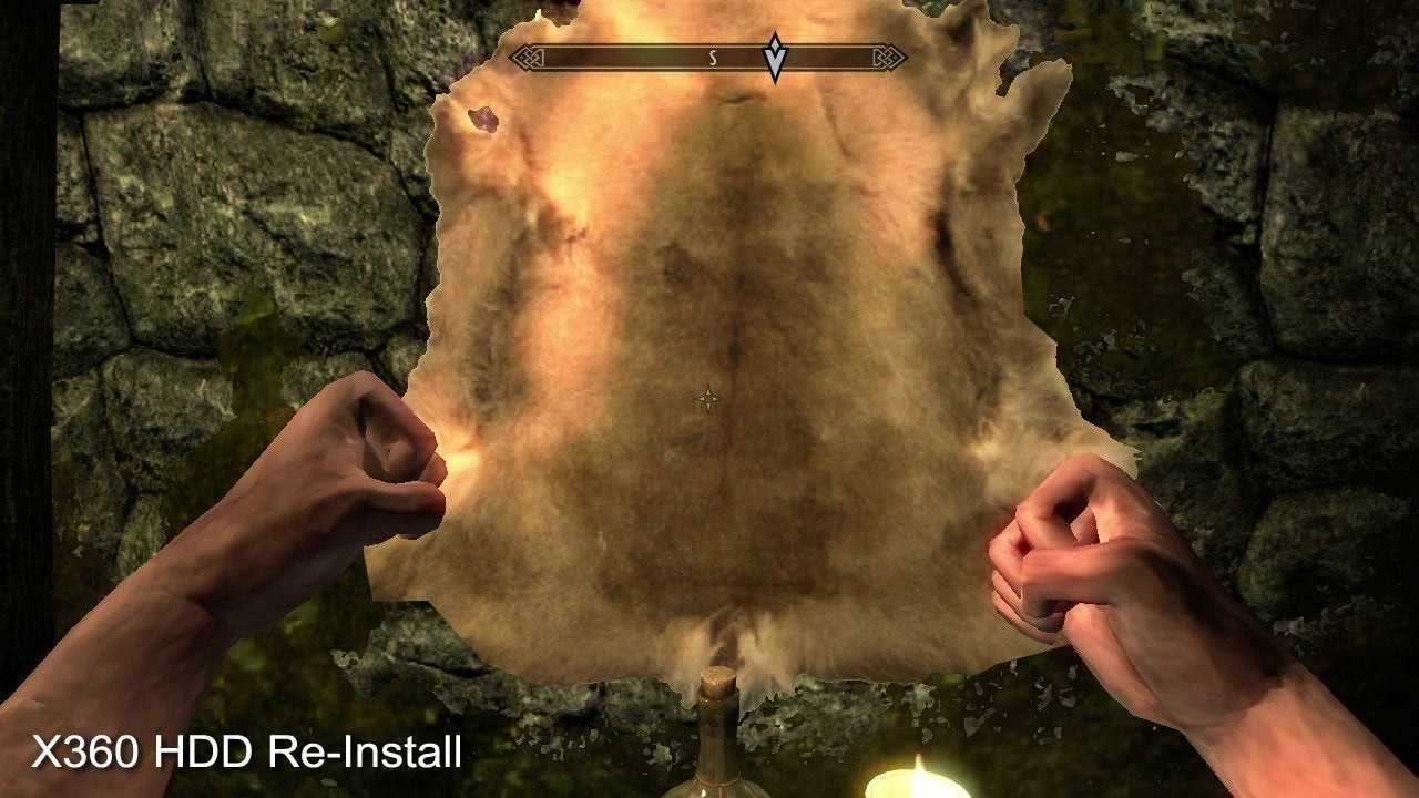 The issue only seems to manifest if you have the Xbox 360 version of Skyrim installed to the hard drive - a process that is entirely optional. In this case, the highest resolution versions of the textures appear to stall and not load, meaning that you're definitely not seeing the game at its best. If you remove the install, and run the game directly from the DVD, the best quality artwork returns to the game.