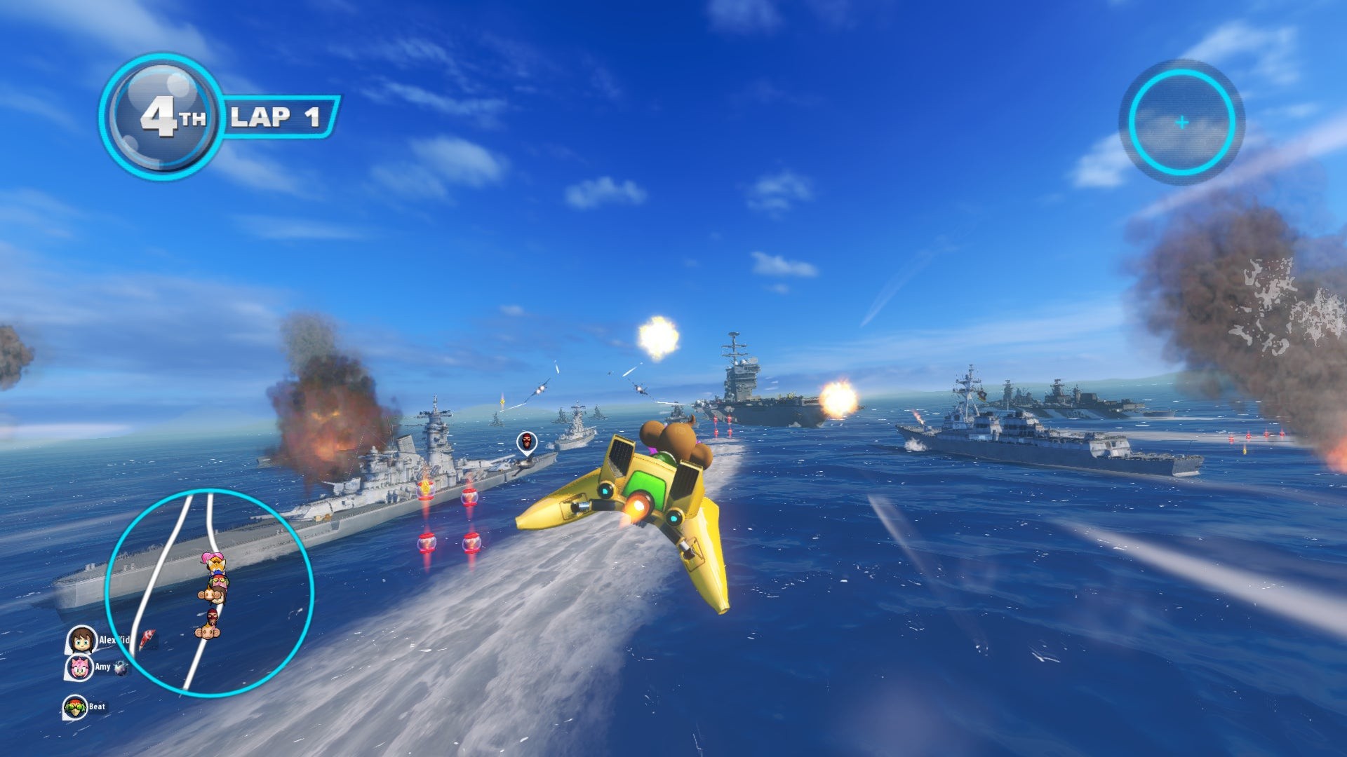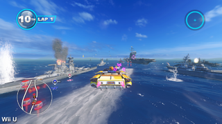 Looking at performance on PS3, 360 and Wii U, we get a very wide spectrum of results. Firstly, it seems the scripted pre-race scenes hold very true to that 30FPS target, with the only major slip downwards coming during a camera sweep across the indoor whirlpool on the Monkey Ball stage. As far as tearing goes during these synchronised scenes, we detect just a few instances of dropped v-sync on PS3 and 360 during explosions on the After Burner flight path.
