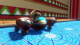Support for the GamePad, for example, at least works on a surface level, with almost every potential usage of the extra screen being broached. We have the inevitable top-down map display, a nifty rear-view mirror option, and capacity for up to five players. The Wii U exclusive modes are entertaining asides, but don't empower the GamePad user with quite enough privileges to justify the separate screen space. Even so, these are at least cursory efforts at trying something new, harmlessly adding to its overall value.