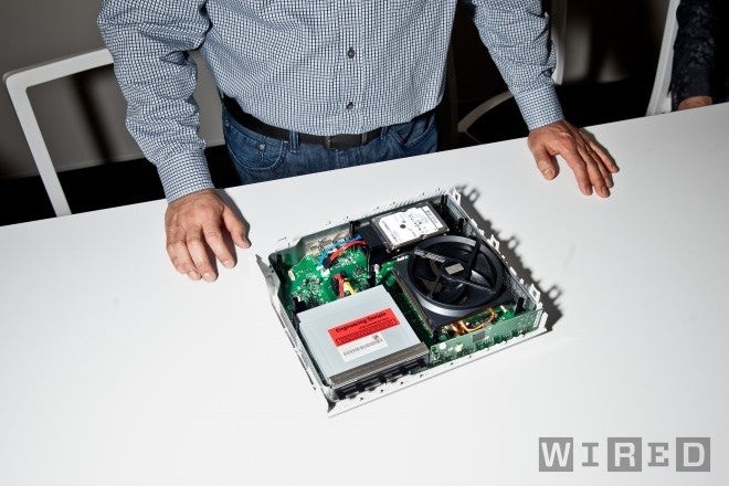The glimpse of the the internals offered up by the Wired shots are intriguing: we have a large, square motherboard with a standard-sized slot-loading Blu-ray drive on the left, while next to it we see a vast heatsink and fan. First impressions are that Microsoft has clearly learned its lessons from the design of the Xbox 360 - the cooler is absolutely massive, sporting copper heatpipes to provide optimal transmission of heat to the sink, before being propelled out of the case by the large fan (the larger it is, the slower it has to spin and thus the more quiet it becomes). Behind the cooler we have a standard 2.5-inch hard drive. Microsoft says that it's not user-replaceable, meaning that 500GB is your lot in terms of internal storage. However, the USB 3.0 ports on the rear and side of the unit accommodate extra storage - we'll assume that this would be standard drives as opposed to any kind of proprietary device the platform holder would like to impose on us.