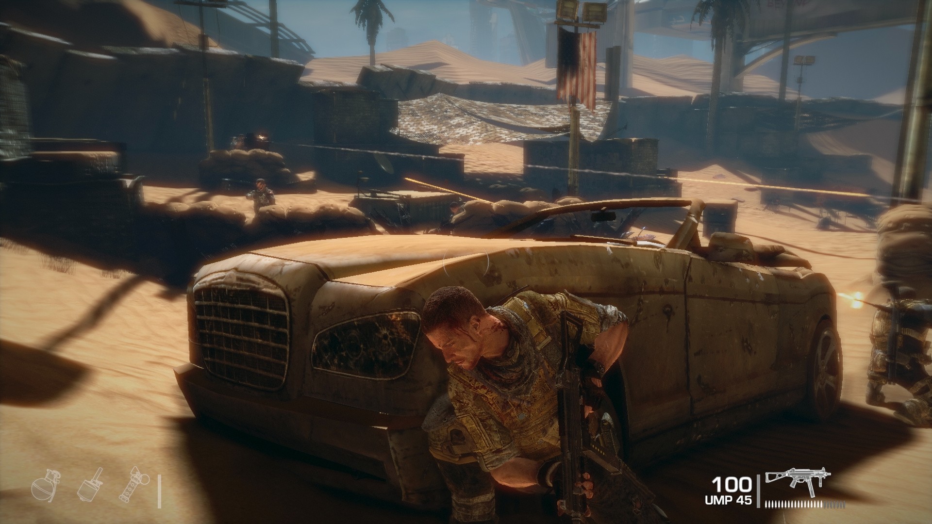 The game world itself provides much in the way of atmosphere, with the way each scene is lit and shaded perfectly capturing the feeling of a scorching hot Middle-Eastern city in turmoil. Light shafts beam through the collapsed buildings, while a warm glow radiates around the environment. Draw distances are fairly expansive, with views of the sandstorm-induced chaos visible for miles, with the layers of dust and particles swooping through the air as the treacherous weather conditions change. It's genuinely impressive stuff.