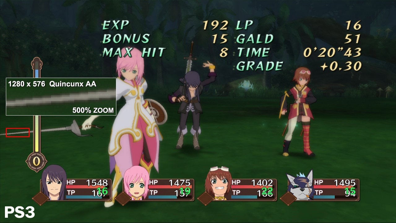 Yup, a it's sub-HD detail level resolved on PlayStation 3, with a bizarre 1280x576 resolution chosen for the game up against 720p on Xbox 360. This results in a somewhat uneven form of scaling for PS3 owners, compounded by the anti-aliasing solution chosen: quincunx, which combined with the lower resolution adds a somewhat obvious, and unwelcome, blur to the game. For its part, Xbox 360 also uses a blur filter as opposed to a proper edge-smoothing solution, but with the additional detail level, the impact is not quite so distracting. Away from the performance elements, and perhaps by way of compensation bearing in mind the delay in launching, Namco Bandai is promising a wealth of unseen content for the full retail release of the PS3 version, including new playable characters, costumes, quests and game areas, along with some level of interfacing with the forthcoming PSP release, Tales of VS.