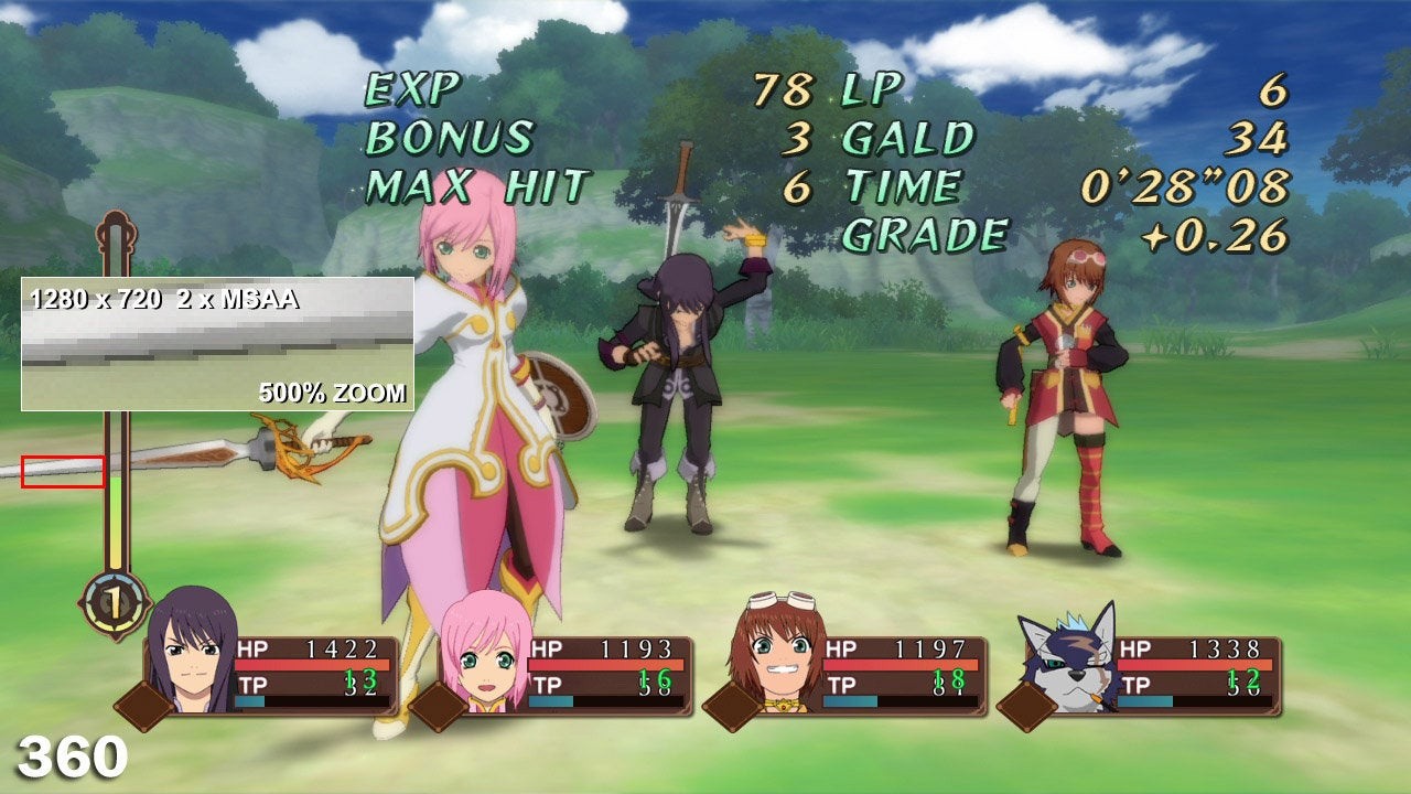 So with that in mind, let's take a look at Tales of Vesperia, the demo of which has recently found its way onto PSN... analysed by MazingerDUDE. Curiously, the actual content of the demo is very different to what Xbox 360 owners got in their download, but there are several differences and similarities that can be discerned. Tales of Vesperia runs at 30FPS in the field sections, while the battle sections run at a crisp 60FPS on both systems. Similarly each version is v-synced, with no tearing.