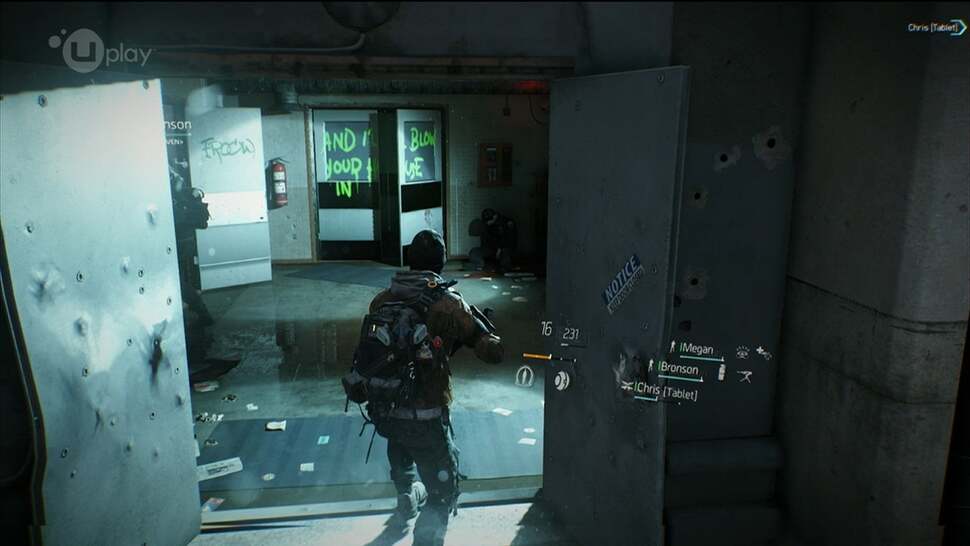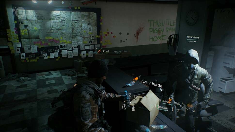 Indoors, lighting comes into its own with torch-lights being directed by other squad members, plus light-shafts streaming through unbarred windows. By means of the rallying signs, maps and post-it notes, The Division's higher resolution texture-work also means we can piece together a personal narrative for how the city has dismantled up until this point. Based on our high quality direct feed of the playthrough used for this analysis, the game world is uncompromising in these micro details. The strength of the PS4 hardware being as such, adopting a smooth anisotropic approach to filtering textures is trivial to overall performance, as much as it is for the modern PC gamer.