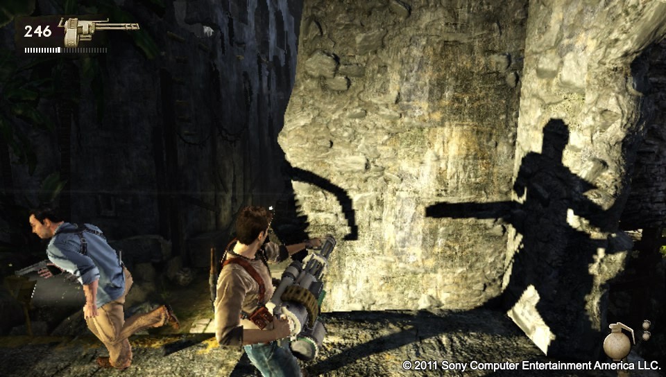 So why the change? At the end of the day, Golden Abyss is an exercise in repurposing a game created for a more powerful system onto a handheld and compromises are a necessary evil. Vita's quad-core Cortex-A9 CPU obviously falls short when compared to the 3.2GHz PPU and seven active SPUs on the PS3's Cell. The layered animation system used by the series since the Drake's Fortune days requires these SPUs to decompress and blend 60 or more basic animations together on Drake. It would seem that the rolling and jumping animations in Golden Abyss revolve around a pre-baked approach, explaining the lack of flexibility during each command, as opposed to the more demanding, procedural, real-time method seen in the home console versions.