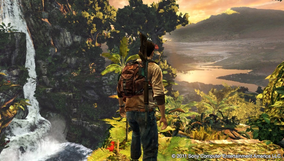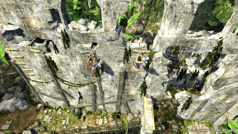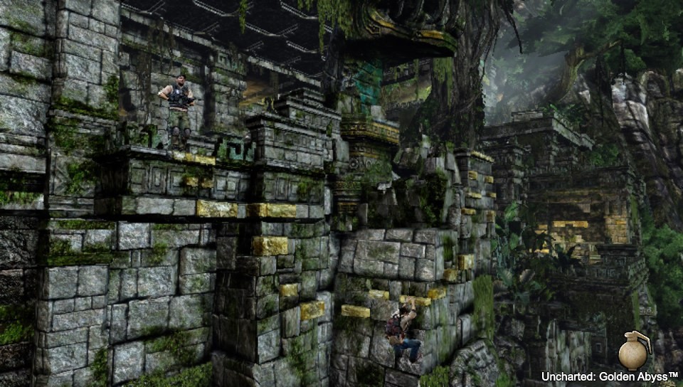 Uncharted: Golden Abyss seems almost akin to an 'Uncharted 1.5' in many ways. Many of the core engine enhancements of the second game are included, such as the permanently engaged v-sync and improved AI for stealth sections, but it does lack the grandiose set-pieces the series has become renowned for. The Vita also struggles to keep the game running at a solid 30FPS, particularly when too many enemies are involved - despite the cutbacks made by way of the decreased internal framebuffer, the pared back animation system, and the lower resolution alpha effects.