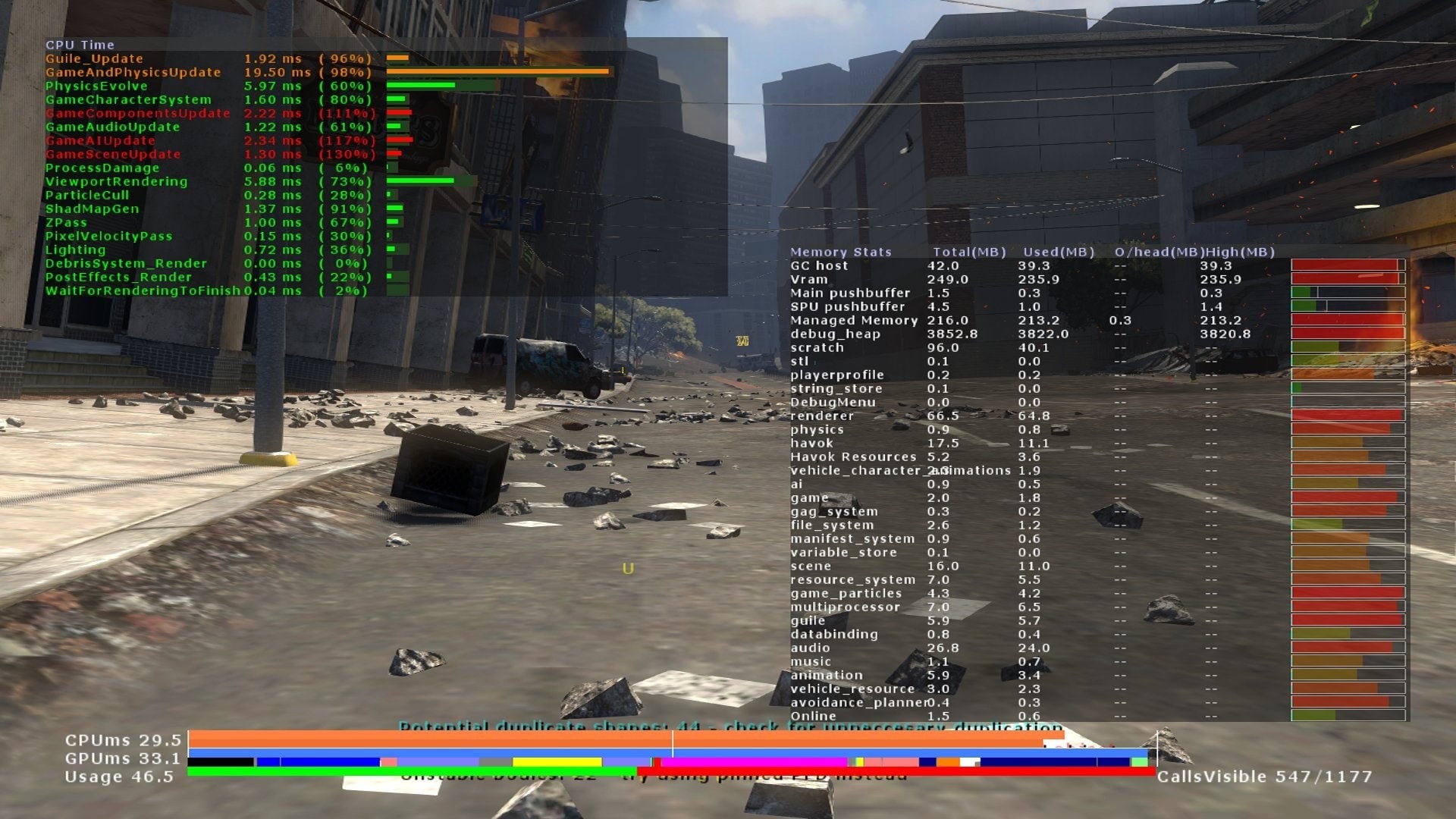 The team also added performance statistics in-game, that allowed the developers to quickly judge whether vehicles or world detail were proving too expensive to render.