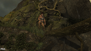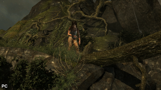 Lara's environment is rendered in higher quality on the PC, where the use of higher resolution textures and normal maps on some surfaces are joined by better anisotropic filtering, adding yet more detail to the lush organic landscapes on offer. Tessellation, which provides various objects with a large geometry boost when moving closer to the camera, is used extensively throughout the game on many surfaces to give these a smoother, more refined look. The effect is also used on Lara herself, especially noticeable in carefully rounding off her fingers during cut-scenes as she grips various objects. These features appear more lifelike and convincing when combined with how Lara herself interacts with the environment, helping to better immerse the player in the experience.