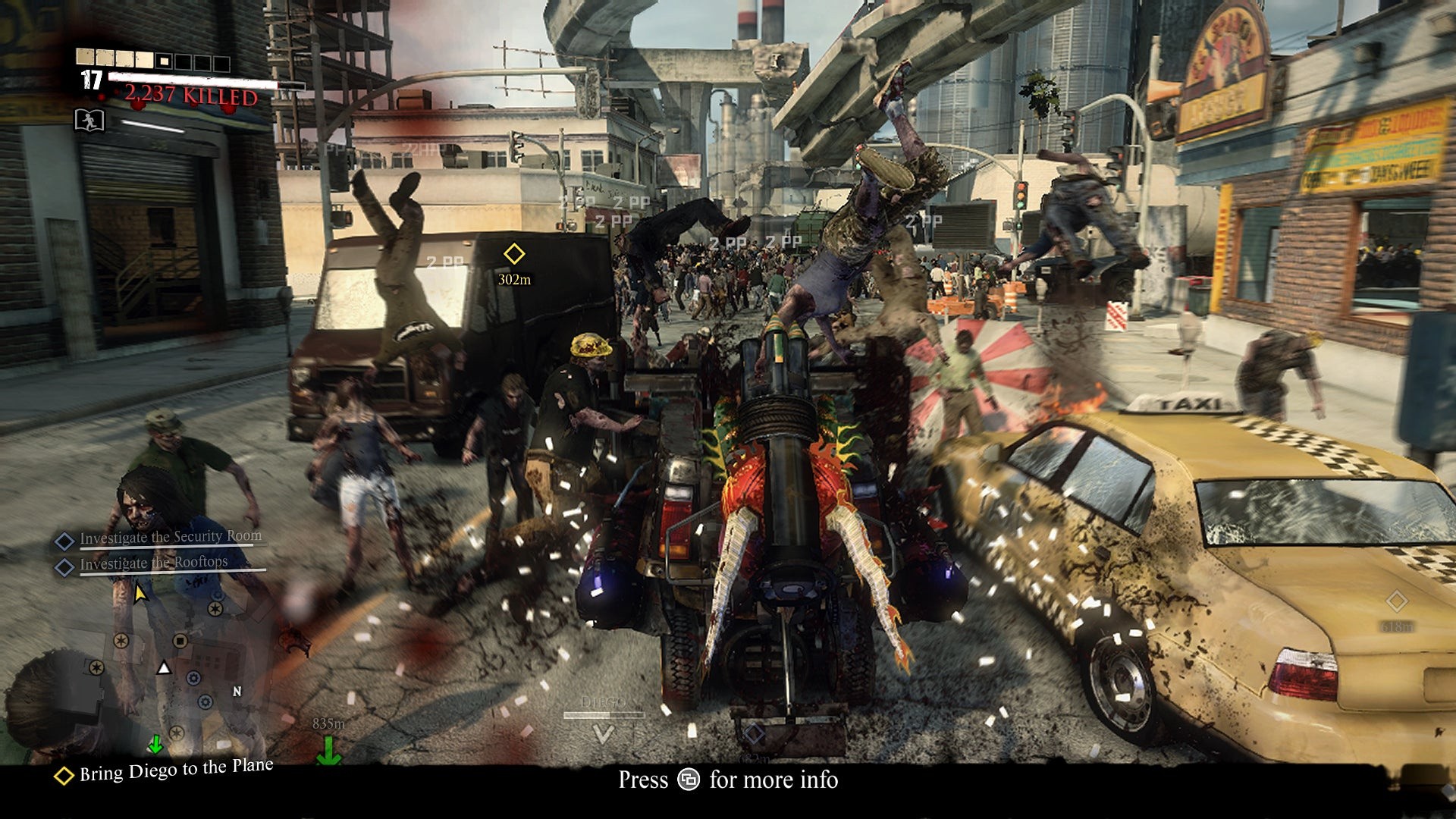 Secondly, in keeping with the mantra of the E3 build, the zombie count is approximately triple that of Dead Rising 2's, opening up potential for ludicrous bouts of carnage when pile-driving through a sea of undead. But even with these added strains on the hardware, thankfully the screen-tear originally seen in a behind-doors session at E3 is now eliminated, giving us a perfectly integral image (though we do note that the version we saw had debug options allowing the developer to turn v-sync on or off). Whether it's during gameplay or cut-scenes, Dead Rising 3 is a more cinematic game for engaging v-sync, something you can see for yourself in our full playthrough of the fifth single-player chapter in the video below.