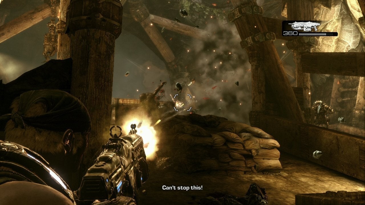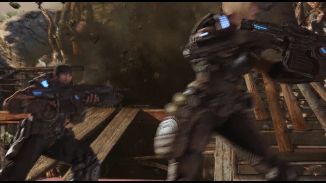 In common with previous Gears titles, Epic background-loads gameplay while FMVs play out on-screen. In order to sustain continuity, these sequences are actually produced by the Gears engine, but they're dumped out to disc and encoded as video as opposed to playing in real-time. The advantage is obvious - so long as you don't hit the "skip" button, the whole experience is seamless, like a movie. The negative point is that disc space is limited and as the Xbox 360 is effectively streaming multiple files at once, the available bandwidth for the video is low. Low levels of bandwidth needn't be a problem for an advanced code like h.264, but the utilisation of the aged Bink video system can't cope with resolving high levels of detail, producing blurry video with lots of macro-blocking - easily the least impressive element of the game.