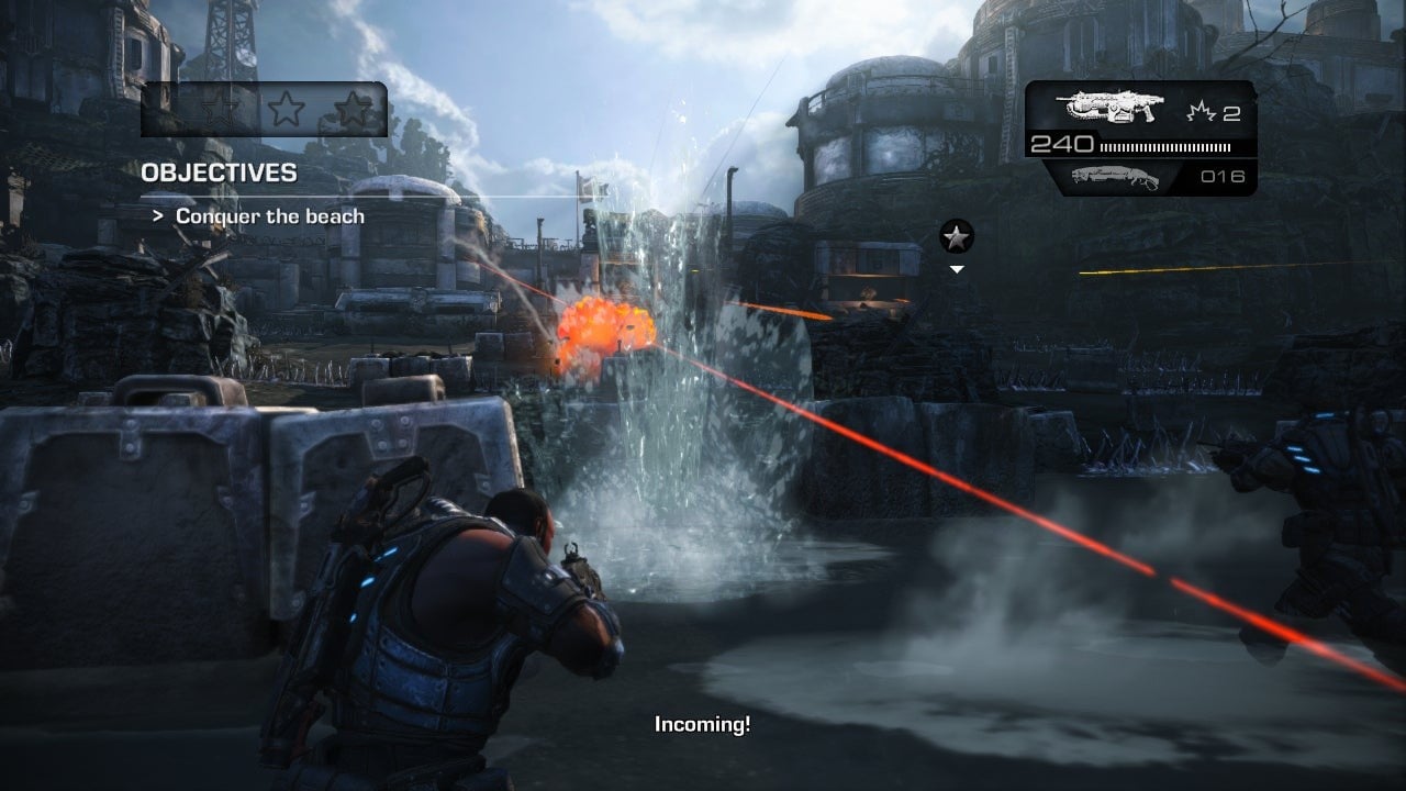 "Other effects are of sky-high quality, from the fluid simulations on blood splatter and the lambent Locust's toxic spills, to the water shader and mortar fire alpha effects during the impressive Normandy landing-style siege."